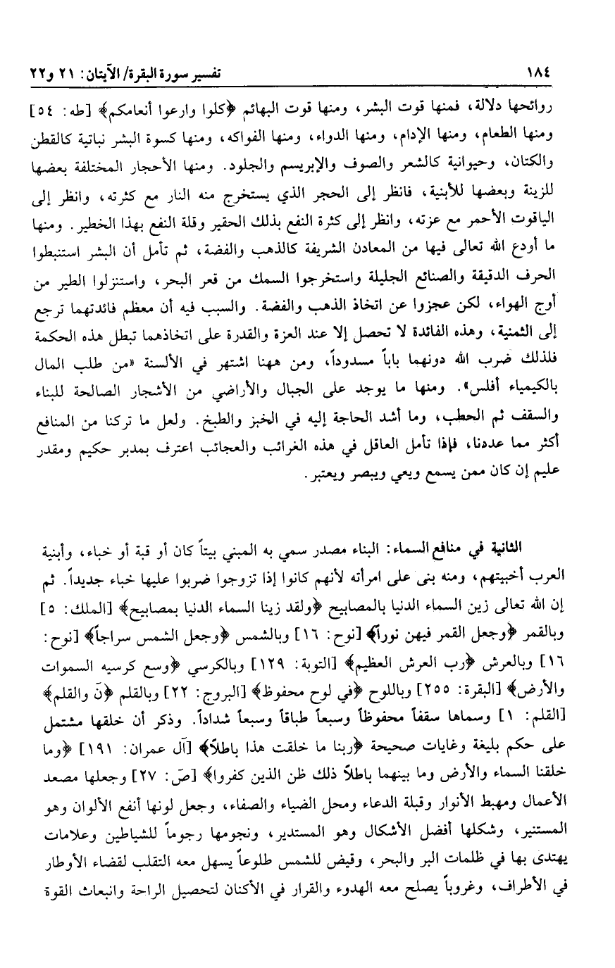 الثانية في منافع السماء: البناء مصدر سمي به المبني بيتا كان أو قبة أو خباء، وأبنية العرب أخبيتهم، ومنه بنى على امرأته لأنهم كانوا إذا تزوجوا ضربوا عليها خباء جديدا. ثم إن الله تعالى زين السماء الدنيا بالمصابيح وَلَقَدْ زَيَّنَّا السَّماءَ الدُّنْيا بِمَصابِيحَ [الملك: 5] وبالقمر وَجَعَلَ الْقَمَرَ فِيهِنَّ نُوراً [نوح: 16] وبالشمس وَجَعَلَ الشَّمْسَ سِراجاً [نوح: