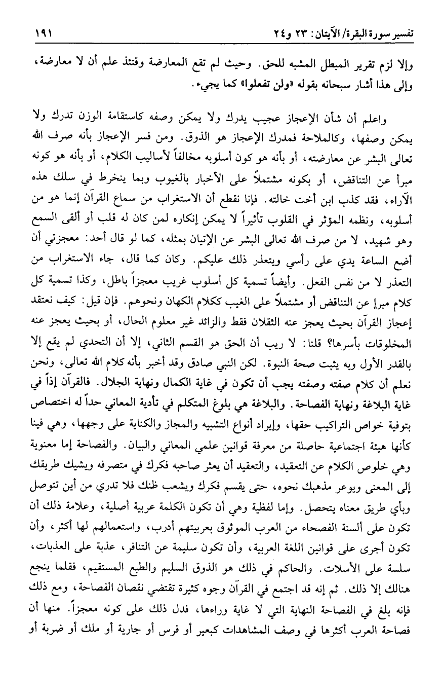 واعلم أن شأن الإعجاز عجيب يدرك ولا يمكن وصفه كاستقامة الوزن تدرك ولا يمكن وصفها، وكالملاحة فمدرك الإعجاز هو الذوق. ومن فسر الإعجاز بأنه صرف الله تعالى البشر عن معارضته، أو بأنه هو كون أسلوبه مخالفا لأساليب الكلام، أو بأنه هو كونه مبرأ عن التناقض، أو بكونه مشتملا على الأخبار بالغيوب وبما ينخرط في سلك هذه الآراء، فقد كذب ابن أخت خالته. فإنا نقطع أن الاستغراب من سماع القرآن إنما هو من أسلوبه، ونظمه المؤثر في القلوب تأثيرا لا يمكن إنكاره لمن كان له قلب أو ألقى السمع وهو شهيد، لا من صرف الله تعالى البشر عن الإتيان بمثله، كما لو قال أحد: معجزتي أن أضع الساعة يدي على رأسي ويتعذر ذلك عليكم. وكان كما قال، جاء الاستغراب من التعذر لا من نفس الفعل. وأيضا تسمية كل أسلوب غريب معجزا باطل، وكذا تسمية كل كلام مبرإ عن التناقض أو مشتملا على الغيب ككلام الكهان ونحوهم. فإن قيل: كيف نعتقد إعجاز القرآن بحيث يعجز عنه الثقلان فقط والزائد غير معلوم الحال، أو بحيث يعجز عنه المخلوقات بأسرها؟ قلنا: لا ريب أن الحق هو القسم الثاني، إلا أن التحدي لم يقع إلا بالقدر الأول وبه يثبت صحة النبوة. لكن النبي صادق وقد أخبر بأنه كلام الله تعالى، ونحن نعلم أن كلام صفته وصفته يجب أن تكون في غاية الكمال ونهاية الجلال. فالقرآن إذا في غاية البلاغة ونهاية الفصاحة. والبلاغة هي بلوغ المتكلم في تأدية المعاني حدا له اختصاص بتوفية خواص التراكيب حقها، وإيراد أنواع التشبيه والمجاز والكناية على وجهها، وهي فينا كأنها هيئة اجتماعية حاصلة من معرفة قوانين علمي المعاني والبيان. والفصاحة إما معنوية وهي خلوص الكلام عن التعقيد، والتعقيد أن يعثر صاحبه فكرك في متصرفه ويشيك طريقك إلى المعنى ويوعر مذهبك نحوه، حتى يقسم فكرك ويشعب ظنك فلا تدري من أين تتوصل وبأي طريق معناه يتحصل. وإما لفظية وهي أن تكون الكلمة عربية أصلية، وعلامة ذلك أن تكون على ألسنة الفصحاء من العرب الموثوق بعربيتهم أدرب، واستعمالهم لها أكثر، وأن تكون أجرى على قوانين اللغة العربية، وأن تكون سليمة عن التنافر، عذبة على العذبات، سلسة على الأسلات. والحاكم في ذلك هو الذوق السليم والطبع المستقيم، فقلما ينجع هنالك إلا ذلك. ثم إنه قد اجتمع في القرآن وجوه كثيرة تقتضي نقصان الفصاحة، ومع ذلك فإنه بلغ في الفصاحة النهاية التي لا غاية وراءها، فدل ذلك على كونه معجزا. منها أن فصاحة العرب أكثرها في وصف المشاهدات كبعير أو فرس أو جارية أو ملك أو ضربة أو