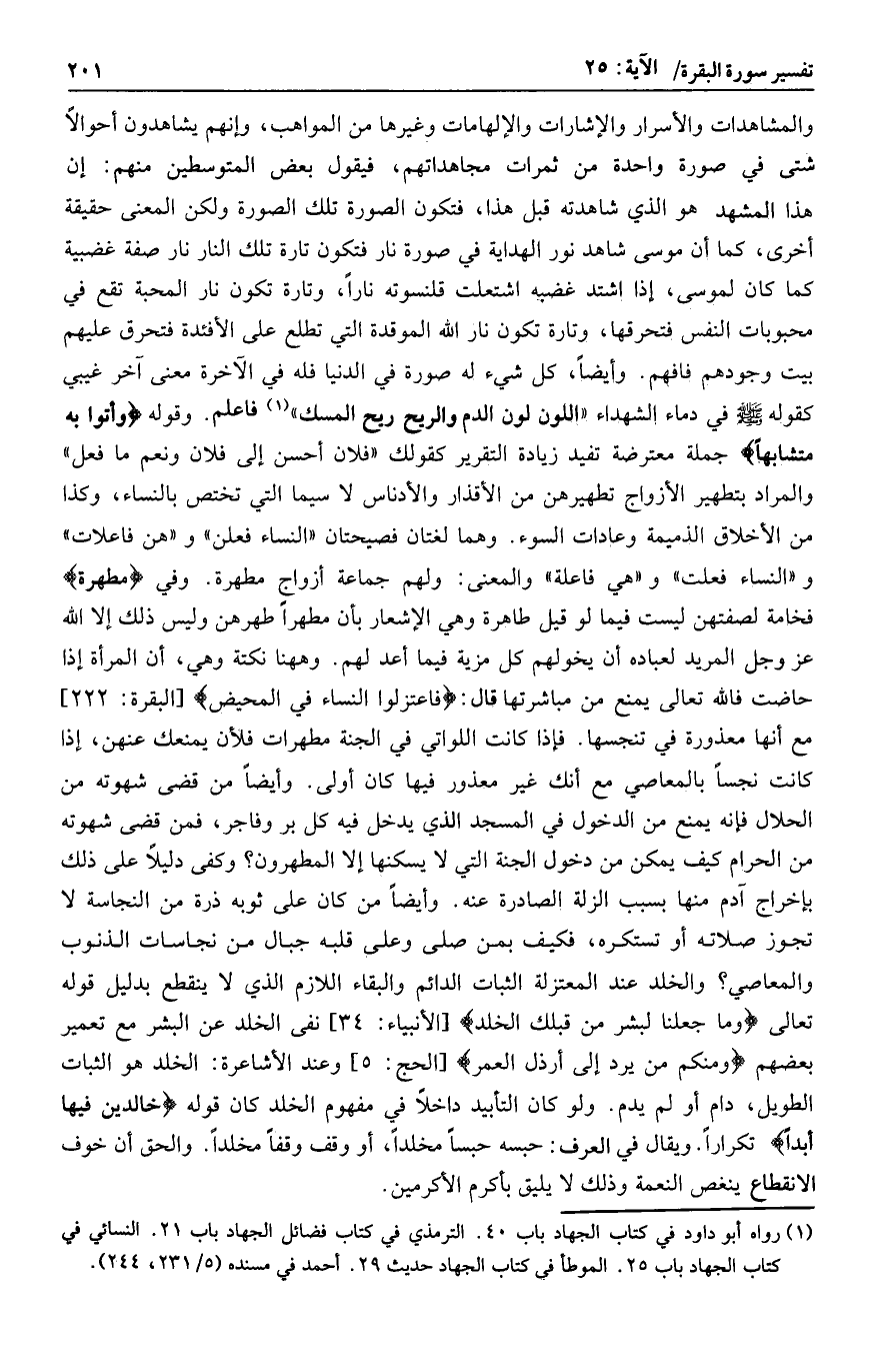 وقوله وَأُتُوا بِهِ مُتَشابِهاً جملة معترضة تفيد زيادة التقرير كقولك «فلان أحسن إلى فلان ونعم ما فعل» والمراد بتطهير الأزواج تطهيرهن من الأقذار والأدناس لا سيما التي تختص بالنساء، وكذا من الأخلاق الذميمة وعادات السوء. وهما لغتان فصيحتان «النساء فعلن» و «هن فاعلات» و «النساء فعلت» و «هي فاعلة» والمعنى: ولهم جماعة أزواج مطهرة. وفي مُطَهَّرَةٌ فخامة لصفتهن ليست فيما لو قيل طاهرة وهي الإشعار بأن مطهرا طهرهن وليس ذلك إلا الله عز وجل المريد لعباده أن يخولهم كل مزية فيما أعد لهم. وهاهنا نكتة وهي، أن المرأة إذا حاضت فالله تعالى يمنع من مباشرتها قال: فَاعْتَزِلُوا النِّساءَ فِي الْمَحِيضِ [البقرة: 222] مع أنها معذورة في تنجسها. فإذا كانت اللواتي في الجنة مطهرات فلأن يمنعك عنهن، إذا كانت نجسا بالمعاصي مع أنك غير معذور فيها كان أولى. وأيضا من قضى شهوته من الحلال فإنه يمنع من الدخول في المسجد الذي يدخل فيه كل بر وفاجر، فمن قضى شهوته من الحرام كيف يمكن من دخول الجنة التي لا يسكنها إلا المطهرون؟ وكفى دليلا على ذلك بإخراج آدم منها بسبب الزلة الصادرة عنه. وأيضا من كان على ثوبه ذرة من النجاسة لا تجوز صلاته أو تستكره، فكيف بمن صلى وعلى قلبه جبال من نجاسات الذنوب والمعاصي؟ والخلد عند المعتزلة الثبات الدائم والبقاء اللازم الذي لا ينقطع بدليل قوله تعالى وَما جَعَلْنا لِبَشَرٍ مِنْ قَبْلِكَ الْخُلْدَ [الأنبياء: 34] نفى الخلد عن البشر مع تعمير بعضهم وَمِنْكُمْ مَنْ يُرَدُّ إِلى أَرْذَلِ الْعُمُرِ [الحج: 5] وعند الأشاعرة: الخلد هو الثبات الطويل، دام أو لم يدم. ولو كان التأبيد داخلا في مفهوم الخلد كان قوله خالِدِينَ فِيها أَبَداً تكرارا. ويقال في العرف: حبسه حبسا مخلدا، أو وقف وقفا مخلدا. والحق أن خوف الانقطاع ينغص النعمة وذلك لا يليق بأكرم الأكرمين.