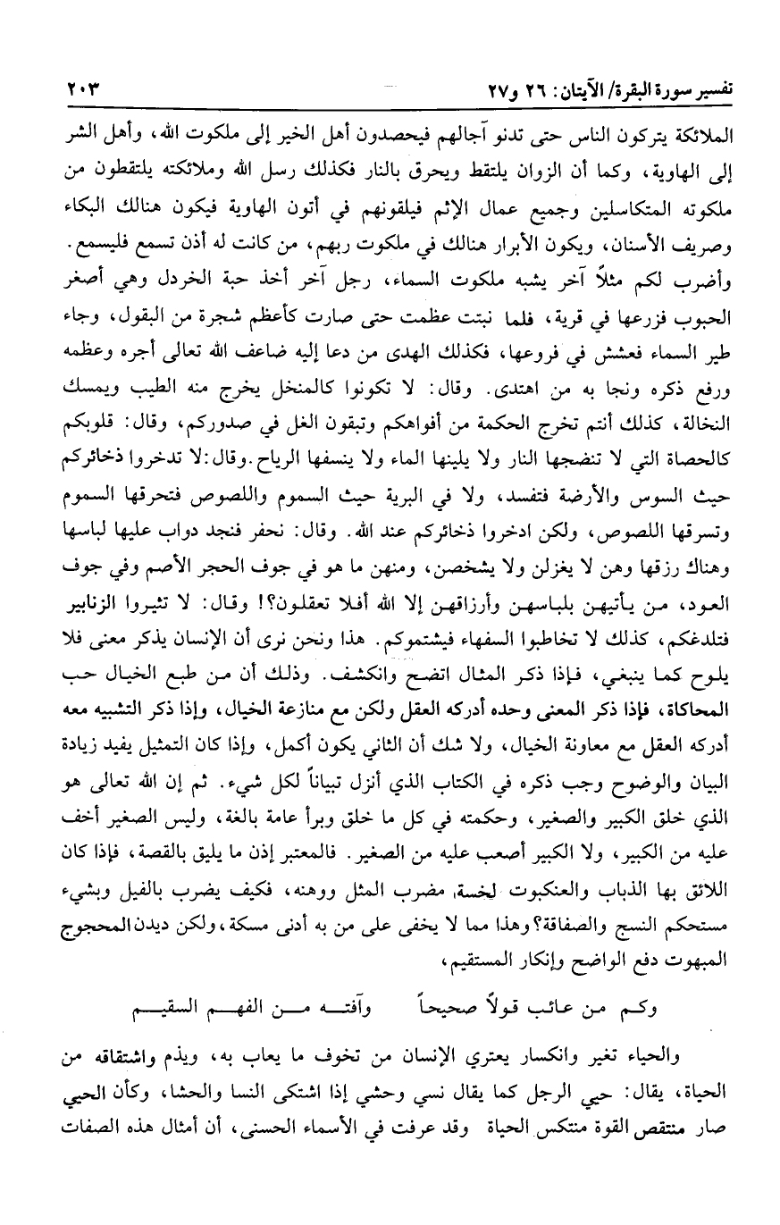وأضرب لكم مثلا آخر يشبه ملكوت السماء، رجل آخر أخذ حبة الخردل وهي أصغر الحبوب فزرعها في قرية، فلما نبتت عظمت حتى صارت كأعظم شجرة من البقول، وجاء طير السماء فعشش في فروعها، فكذلك الهدى من دعا إليه ضاعف الله تعالى أجره وعظمه ورفع ذكره ونجا به من اهتدى. وقال: لا تكونوا كالمنخل يخرج منه الطيب ويمسك النخالة، كذلك أنتم تخرج الحكمة من أفواهكم وتبقون الغل في صدوركم، وقال: قلوبكم كالحصاة التي لا تنضجها النار ولا يلينها الماء ولا ينسفها الرياح. وقال: لا تدخروا ذخائركم حيث السوس والأرضة فتفسد، ولا في البرية حيث السموم واللصوص فتحرقها السموم وتسرقها اللصوص، ولكن ادخروا ذخائركم عند الله. وقال: نحفر فنجد دواب عليها لباسها وهناك رزقها وهن لا يغزلن ولا يشخصن، ومنهن ما هو في جوف الحجر الأصم وفي جوف العود، من يأتيهن بلباسهن وأرزاقهن إلا الله أفلا تعقلون؟! وقال: لا تثيروا الزنابير فتلدغكم، كذلك لا تخاطبوا السفهاء فيشتموكم. هذا ونحن نرى أن الإنسان يذكر معنى فلا يلوح كما ينبغي، فإذا ذكر المثال اتضح وانكشف. وذلك أن من طبع الخيال حب المحاكاة، فإذا ذكر المعنى وحده أدركه العقل ولكن مع منازعة الخيال، وإذا ذكر التشبيه معه أدركه العقل مع معاونة الخيال، ولا شك أن الثاني يكون أكمل، وإذا كان التمثيل يفيد زيادة البيان والوضوح وجب ذكره في الكتاب الذي أنزل تبيانا لكل شيء. ثم إن الله تعالى هو الذي خلق الكبير والصغير، وحكمته في كل ما خلق وبرأ عامة بالغة، وليس الصغير أخف عليه من الكبير، ولا الكبير أصعب عليه من الصغير. فالمعتبر إذن ما يليق بالقصة، فإذا كان اللائق بها الذباب والعنكبوت لخسة مضرب المثل ووهنه، فكيف يضرب بالفيل وبشيء مستحكم النسج والصفاقة؟ وهذا مما لا يخفى على من به أدنى مسكة، ولكن ديدن المحجوج المبهوت دفع الواضح وإنكار المستقيم،