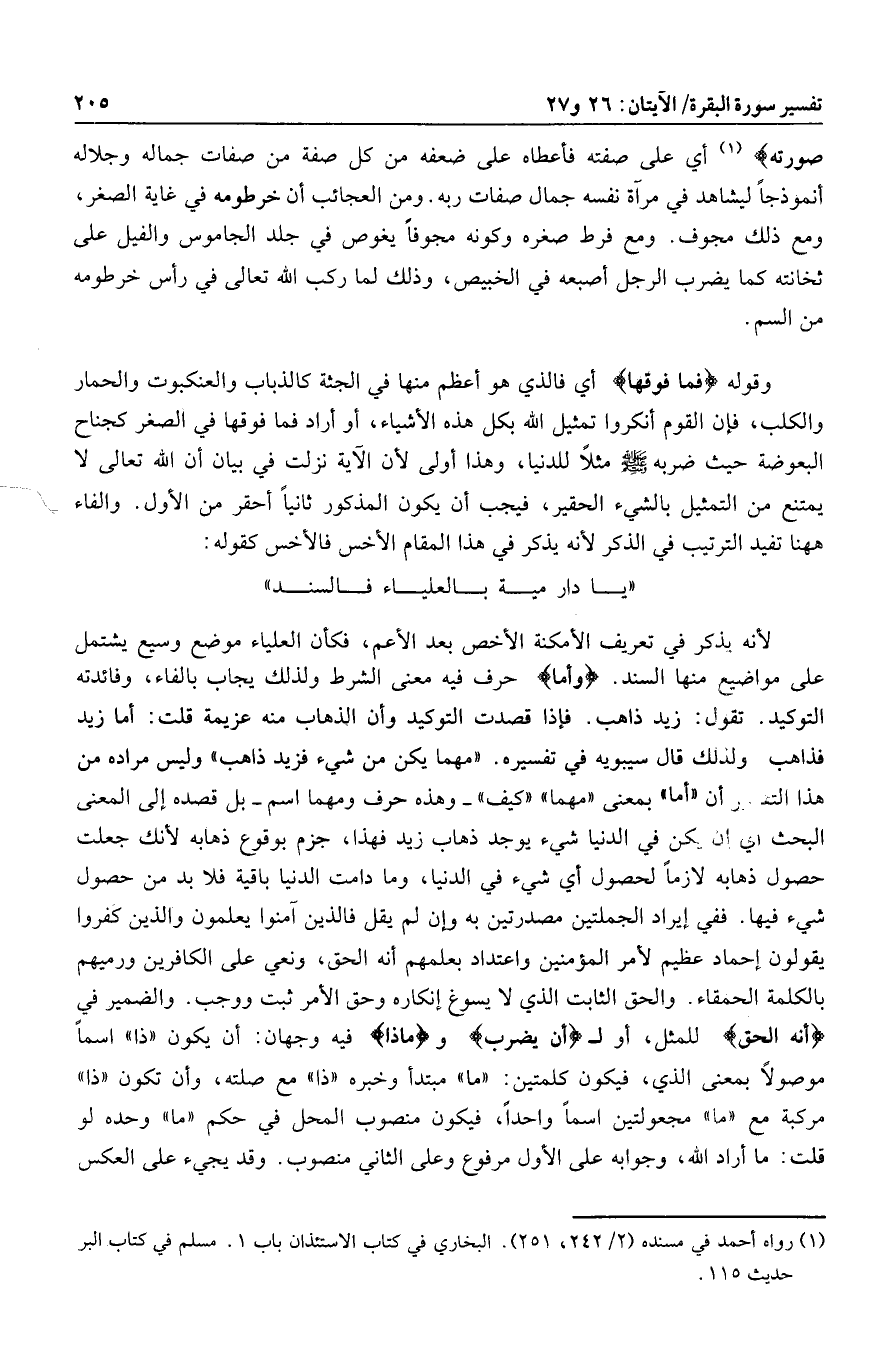 «يا دار مية بالعلياء فالسند» لأنه يذكر في تعريف الأمكنة الأخص بعد الأعم، فكأن العلياء موضع وسيع يشتمل على مواضيع منها السند. وَأَمَّا حرف فيه معنى الشرط ولذلك يجاب بالفاء، وفائدته التوكيد. تقول: زيد ذاهب. فإذا قصدت التوكيد وأن الذهاب منه عزيمة قلت: أما زيد فذاهب ولذلك قال سيبويه في تفسيره. «مهما يكن من شيء فزيد ذاهب» وليس مراده من هذا التفسير أن «أما» بمعنى «مهما» «كيف» - وهذه حرف ومهما اسم- بل قصده إلى المعنى البحث أي إن يكن في الدنيا شيء يوجد ذهاب زيد فهذا، جزم بوقوع ذهابه لأنك جعلت حصول ذهابه لازما لحصول أي شيء في الدنيا، وما دامت الدنيا باقية فلا بد من حصول شيء فيها. ففي إيراد الجملتين مصدرتين به وإن لم يقل فالذين آمنوا يعلمون والذين كفروا يقولون إحماد عظيم لأمر المؤمنين واعتداد بعلمهم أنه الحق، ونعي على الكافرين ورميهم بالكلمة الحمقاء. والحق الثابت الذي لا يسوغ إنكاره وحق الأمر ثبت ووجب. والضمير في أَنَّهُ الْحَقُّ للمثل، أو ل أَنْ يَضْرِبَ وماذا فيه وجهان: أن يكون «ذا» اسما موصولا بمعنى الذي، فيكون كلمتين: «ما» مبتدأ وخبره «ذا» مع صلته، وأن تكون «ذا» مركبة مع «ما» مجعولتين اسما واحدا، فيكون منصوب المحل في حكم «ما» وحده لو قلت: ما أراد الله، وجوابه على الأول مرفوع وعلى الثاني منصوب. وقد يجيء على العكس
