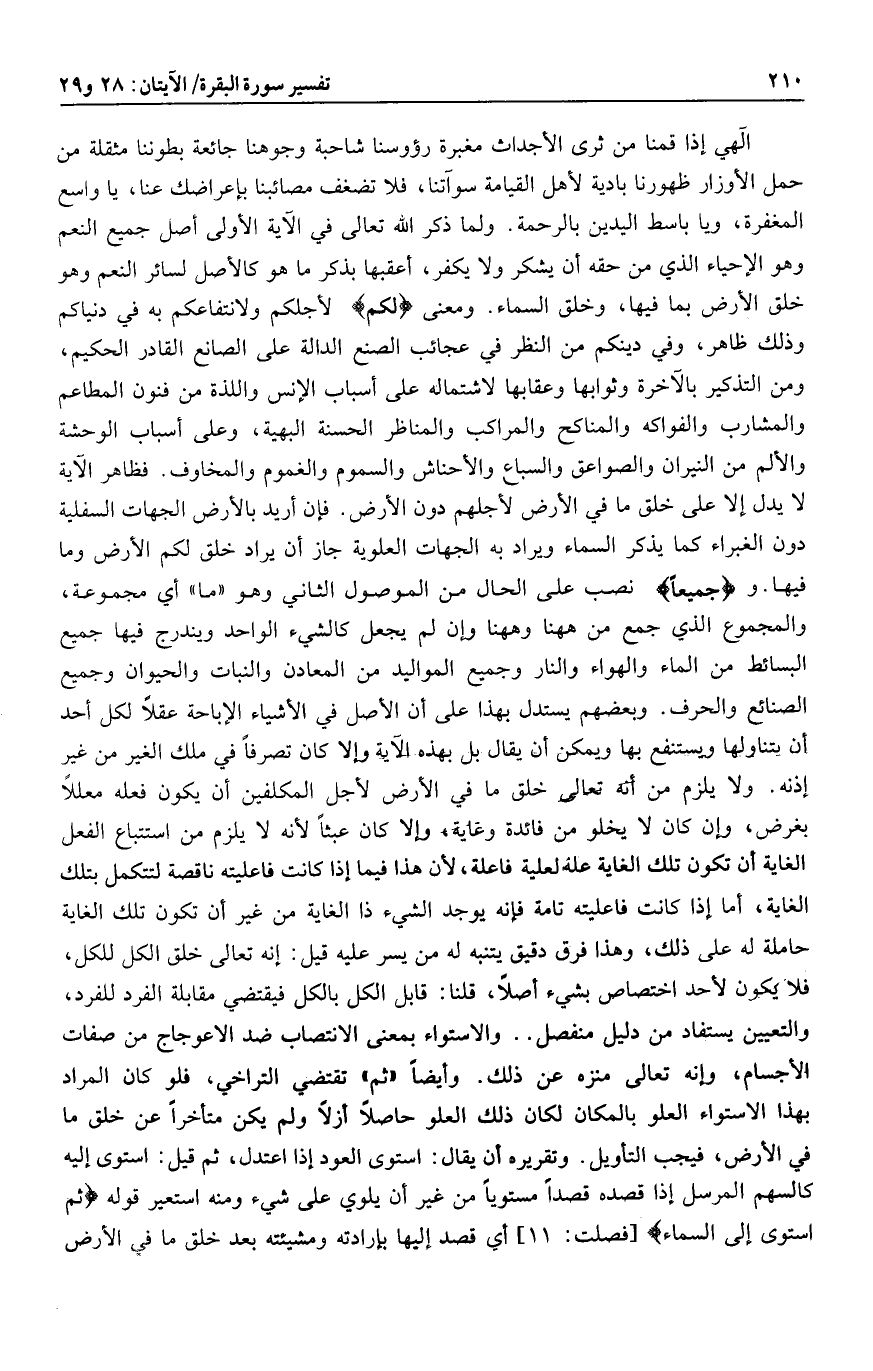 الهي إذا قمنا من ثرى الأجداث مغبرة رؤوسنا شاحبة وجوهنا جائعة بطوننا مثقلة من حمل الأوزار ظهورنا بادية لأهل القيامة سوآتنا، فلا تضغف مصائبنا بإعراضك عنا، يا واسع المغفرة، ويا باسط اليدين بالرحمة. ولما ذكر الله تعالى في الآية الأولى أصل جميع النعم وهو الإحياء الذي من حقه أن يشكر ولا يكفر، أعقبها بذكر ما هو كالأصل لسائر النعم وهو خلق الأرض بما فيها، وخلق السماء. ومعنى لَكُمْ لأجلكم ولانتفاعكم به في دنياكم وذلك ظاهر، وفي دينكم من النظر في عجائب الصنع الدالة على الصانع القادر الحكيم، ومن التذكير بالآخرة وثوابها وعقابها لاشتماله على أسباب الإنس واللذة من فنون المطاعم والمشارب والفواكه والمناكح والمراكب والمناظر الحسنة البهية، وعلى أسباب الوحشة والألم من النيران والصواعق والسباع والأحناش والسموم والغموم والمخاوف. فظاهر الآية لا يدل إلا على خلق ما في الأرض لأجلهم دون الأرض. فإن أريد بالأرض الجهات السفلية دون الغبراء كما يذكر السماء ويراد به الجهات العلوية جاز أن يراد خلق لكم الأرض وما فيها. وجَمِيعاً نصب على الحال من الموصول الثاني وهو «ما» أي مجموعة، والمجموع الذي جمع من هاهنا وهاهنا وإن لم يجعل كالشيء الواحد ويندرج فيها جميع البسائط من الماء والهواء والنار وجميع المواليد من المعادن والنبات والحيوان وجميع الصنائع والحرف. وبعضهم يستدل بهذا على أن الأصل في الأشياء الإباحة عقلا لكل أحد أن يتناولها ويستنفع بها ويمكن أن يقال بل بهذه الآية وإلا كان تصرفا في ملك الغير من غير إذنه. ولا يلزم من أنه تعالى خلق ما في الأرض لأجل المكلفين أن يكون فعله معللا بغرض، وإن كان لا يخلو من فائدة وغاية، وإلا كان عبثا لأنه لا يلزم من استتباع الفعل الغاية أن تكون تلك الغاية علة لعلية فاعلة، لأن هذا فيما إذا كانت فاعليته ناقصة لتتكمل بتلك الغاية، أما إذا كانت فاعليته تامة فإنه يوجد الشيء ذا الغاية من غير أن تكون تلك الغاية حاملة له على ذلك، وهذا فرق دقيق يتنبه له من يسر عليه قيل: إنه تعالى خلق الكل للكل، فلا يكون لأحد اختصاص بشيء أصلا، قلنا: قابل الكل بالكل فيقتضي مقابلة الفرد للفرد، والتعيين يستفاد من دليل منفصل.. والاستواء بمعنى الانتصاب ضد الاعوجاج من صفات الأجسام، وإنه تعالى منزه عن ذلك. وأيضا «ثم» تقتضي التراخي، فلو كان المراد بهذا الاستواء العلو بالمكان لكان ذلك العلو حاصلا أزلا ولم يكن متأخرا عن خلق ما في الأرض، فيجب التأويل. وتقريره أن يقال: استوى العود إذا اعتدل، ثم قيل: استوى إليه كالسهم المرسل إذا قصده قصدا مستويا من غير أن يلوي على شيء ومنه استعير قوله ثُمَّ اسْتَوى إِلَى السَّماءِ [فصلت: 11] أي قصد إليها بإرادته ومشيئته بعد خلق ما في الأرض
