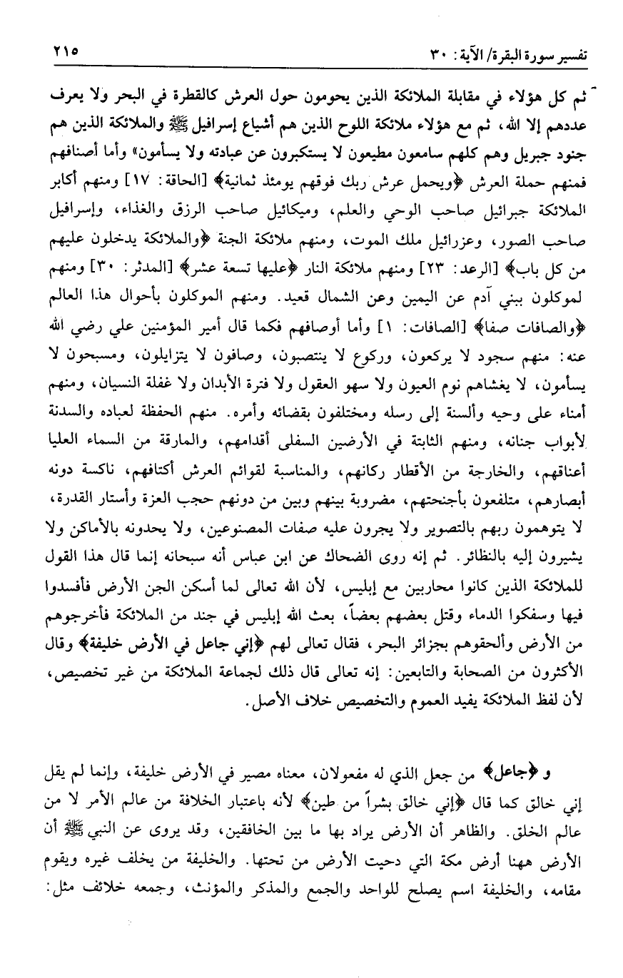 ثم إنه روى الضحاك عن ابن عباس أنه سبحانه إنما قال هذا القول للملائكة الذين كانوا محاربين مع إبليس، لأن الله تعالى لما أسكن الجن الأرض فأفسدوا فيها وسفكوا الدماء وقتل بعضهم بعضا، بعث الله إبليس في جند من الملائكة فأخرجوهم من الأرض وألحقوهم بجزائر البحر، فقال تعالى لهم إِنِّي جاعِلٌ فِي الْأَرْضِ خَلِيفَةً وقال الأكثرون من الصحابة والتابعين: إنه تعالى قال ذلك لجماعة الملائكة من غير تخصيص، لأن لفظ الملائكة يفيد العموم والتخصيص خلاف الأصل.
