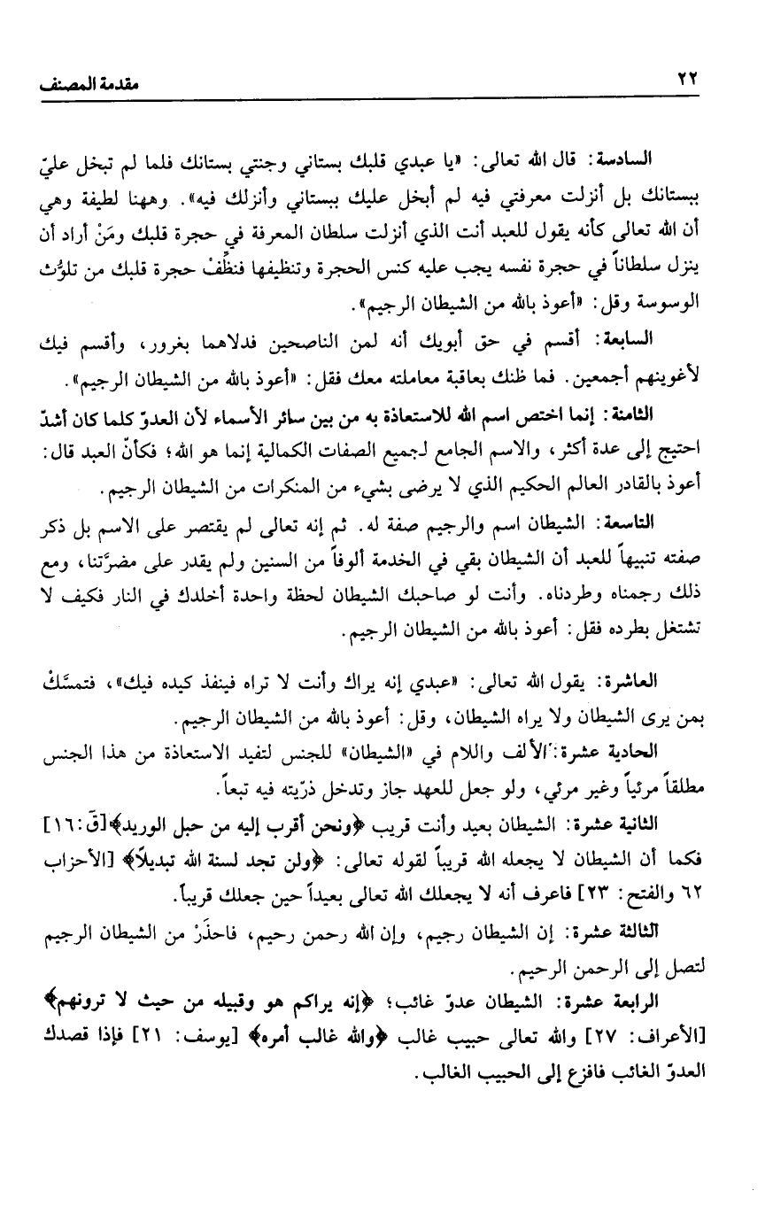 الرابعة عشرة: الشيطان عدوّ غائب إِنَّهُ يَراكُمْ هُوَ وَقَبِيلُهُ مِنْ حَيْثُ لا تَرَوْنَهُمْ [الأعراف: 27] والله تعالى حبيب غالب وَاللَّهُ غالِبٌ عَلى أَمْرِهِ [يوسف: 21] فإذا قصدك العدوّ الغائب فافزع إلى الحبيب الغالب.