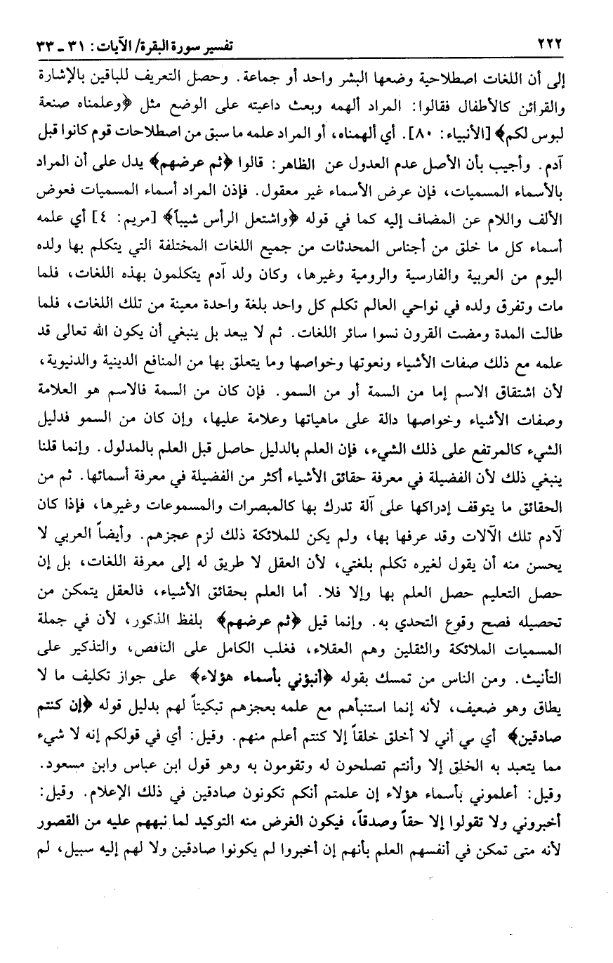 إلى أن اللغات اصطلاحية وضعها البشر واحد أو جماعة. وحصل التعريف للباقين بالإشارة والقرائن كالأطفال فقالوا: المراد ألهمه وبعث داعيته على الوضع مثل وَعَلَّمْناهُ صَنْعَةَ لَبُوسٍ لَكُمْ [الأنبياء: 80] . أي ألهمناه، أو المراد علمه ما سبق من اصطلاحات قوم كانوا قبل آدم. وأجيب بأن الأصل عدم العدول عن الظاهر: قالوا ثُمَّ عَرَضَهُمْ يدل على أن المراد بالأسماء المسميات، فإن عرض الأسماء غير معقول. فإذن المراد أسماء المسميات فعوض الألف واللام عن المضاف إليه كما في قوله وَاشْتَعَلَ الرَّأْسُ شَيْباً [مريم: 4] أي علمه أسماء كل ما خلق من أجناس المحدثات من جميع اللغات المختلفة التي يتكلم بها ولده اليوم من العربية والفارسية والرومية وغيرها، وكان ولد آدم يتكلمون بهذه اللغات، فلما مات وتفرق ولده في نواحي العالم تكلم كل واحد بلغة واحدة معينة من تلك اللغات، فلما طالت المدة ومضت القرون نسوا سائر اللغات. ثم لا يبعد بل ينبغي أن يكون الله تعالى قد علمه مع ذلك صفات الأشياء ونعوتها وخواصها وما يتعلق بها من المنافع الدينية والدنيوية، لأن اشتقاق الاسم إما من السمة أو من السمو. فإن كان من السمة فالاسم هو العلامة وصفات الأشياء وخواصها دالة على ماهياتها وعلامة عليها، وإن كان من السمو فدليل الشيء كالمرتفع على ذلك الشيء، فإن العلم بالدليل حاصل قبل العلم بالمدلول. وإنما قلنا ينبغي ذلك لأن الفضيلة في معرفة حقائق الأشياء أكثر من الفضيلة في معرفة أسمائها. ثم من الحقائق ما يتوقف إدراكها على آلة تدرك بها كالمبصرات والمسموعات وغيرها، فإذا كان لآدم تلك الآلات وقد عرفها بها، ولم يكن للملائكة ذلك لزم عجزهم. وأيضا العربي لا يحسن منه أن يقول لغيره تكلم بلغتي، لأن العقل لا طريق له إلى معرفة اللغات، بل إن حصل التعليم حصل العلم بها وإلا فلا. أما العلم بحقائق الأشياء، فالعقل يتمكن من تحصيله فصح وقوع التحدي به. وإنما قيل ثُمَّ عَرَضَهُمْ بلفظ الذكور، لأن في جملة المسميات الملائكة والثقلين وهم العقلاء، فغلب الكامل على الناقص، والتذكير على التأنيث. ومن الناس من تمسك بقوله أَنْبِئُونِي بِأَسْماءِ هؤُلاءِ على جواز تكليف ما لا يطاق وهو ضعيف، لأنه إنما استنبأهم مع علمه بعجزهم تبكيتا لهم بدليل قوله إِنْ كُنْتُمْ صادِقِينَ أي في أني لا أخلق خلقا إلا كنتم أعلم منهم. وقيل: أي في قولكم إنه لا شيء مما يتعبد به الخلق إلا وأنتم تصلحون له وتقومون به وهو قول ابن عباس وابن مسعود.