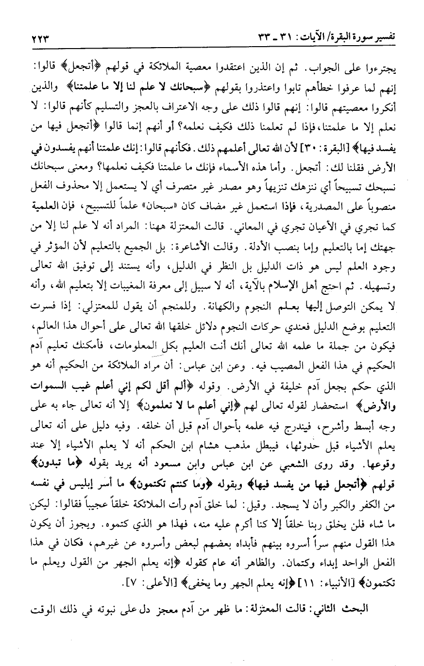 إنهم لما عرفوا خطأهم تابوا واعتذروا بقولهم سُبْحانَكَ لا عِلْمَ لَنا إِلَّا ما عَلَّمْتَنا والذين أنكروا معصيتهم قالوا: إنهم قالوا ذلك على وجه الاعتراف بالعجز والتسليم كأنهم قالوا: لا نعلم إلا ما علمتنا، فإذا لم تعلمنا ذلك فكيف نعلمه؟ أو أنهم إنما قالوا أَتَجْعَلُ فِيها مَنْ يُفْسِدُ فِيها [البقرة: 30] لأن الله تعالى أعلمهم ذلك. فكأنهم قالوا: إنك علمتنا أنهم يفسدون في الأرض فقلنا لك: أتجعل. وأما هذه الأسماء فإنك ما علمتنا فكيف نعلمها؟ ومعنى سبحانك نسبحك تسبيحا أي ننزهك تنزيها وهو مصدر غير متصرف أي لا يستعمل إلا محذوف الفعل منصوبا على المصدرية، فإذا استعمل غير مضاف كان «سبحان» علما للتسبيح، فإن العلمية كما تجري في الأعيان تجري في المعاني. قالت المعتزلة هاهنا: المراد أنه لا علم لنا إلا من جهتك إما بالتعليم وإما بنصب الأدلة. وقالت الأشاعرة: بل الجميع بالتعليم لأن المؤثر في وجود العلم ليس هو ذات الدليل بل النظر في الدليل، وأنه يستند إلى توفيق الله تعالى وتسهيله. ثم احتج أهل الإسلام بالآية، أنه لا سبيل إلى معرفة المغيبات إلا بتعليم الله، وأنه لا يمكن التوصل إليها بعلم النجوم والكهانة. وللمنجم أن يقول للمعتزلي: إذا فسرت التعليم بوضع الدليل فعندي حركات النجوم دلائل خلقها الله تعالى على أحوال هذا العالم، فيكون من جملة ما علمه الله تعالى أنك أنت العليم بكل المعلومات، فأمكنك تعليم آدم الحكيم في هذا الفعل المصيب فيه. وعن ابن عباس: أن مراد الملائكة من الحكيم أنه هو الذي حكم بجعل آدم خليفة في الأرض. وقوله أَلَمْ أَقُلْ لَكُمْ إِنِّي أَعْلَمُ غَيْبَ السَّماواتِ وَالْأَرْضِ استحضار لقوله تعالى لهم إِنِّي أَعْلَمُ ما لا تَعْلَمُونَ إلا أنه تعالى جاء به على وجه أبسط وأشرح، فيندرج فيه علمه بأحوال آدم قبل أن خلقه. وفيه دليل على أنه تعالى يعلم الأشياء قبل حدوثها، فيبطل مذهب هشام ابن الحكم أنه لا يعلم الأشياء إلا عند وقوعها. وقد روى الشعبي عن ابن عباس وابن مسعود أنه يريد بقوله ما تُبْدُونَ قولهم أَتَجْعَلُ فِيها مَنْ يُفْسِدُ فِيها وبقوله وَما كُنْتُمْ تَكْتُمُونَ ما أسر إبليس في نفسه من الكفر والكبر وأن لا يسجد. وقيل: لما خلق آدم رأت الملائكة خلقا عجيبا فقالوا: ليكن ما شاء فلن يخلق ربنا خلقا إلا كنا أكرم عليه منه، فهذا هو الذي كتموه. ويجوز أن يكون هذا القول منهم سرا أسروه بينهم فأبداه بعضهم لبعض وأسروه عن غيرهم، فكان في هذا الفعل الواحد إبداء وكتمان. والظاهر أنه عام كقوله إِنَّهُ يَعْلَمُ الْجَهْرَ مِنَ الْقَوْلِ وَيَعْلَمُ ما تَكْتُمُونَ [الأنبياء: 11] إِنَّهُ يَعْلَمُ الْجَهْرَ وَما يَخْفى [الأعلى: 7] .
