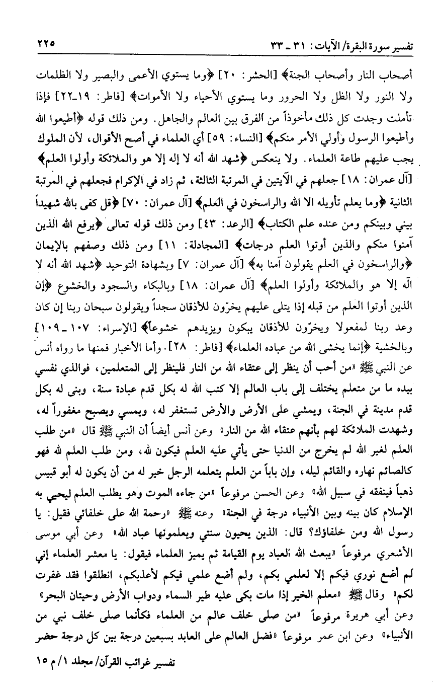 [الحشر: 20] وَما يَسْتَوِي الْأَعْمى وَالْبَصِيرُ وَلَا الظُّلُماتُ وَلَا النُّورُ وَلَا الظِّلُّ وَلَا الْحَرُورُ وَما يَسْتَوِي الْأَحْياءُ وَلَا الْأَمْواتُ [فاطر: 19- 22] فإذا تأملت وجدت كل ذلك مأخوذا من الفرق بين العالم والجاهل. ومن ذلك قوله أَطِيعُوا اللَّهَ وَأَطِيعُوا الرَّسُولَ وَأُولِي الْأَمْرِ مِنْكُمْ [النساء: 59] أي العلماء في أصح الأقوال، لأن الملوك يجب عليهم طاعة العلماء. ولا ينعكس شَهِدَ اللَّهُ أَنَّهُ لا إِلهَ إِلَّا هُوَ وَالْمَلائِكَةُ وَأُولُوا الْعِلْمِ [آل عمران: 18] جعلهم في الآيتين في المرتبة الثالثة، ثم زاد في الإكرام فجعلهم في المرتبة الثانية وَما يَعْلَمُ تَأْوِيلَهُ إِلَّا اللَّهُ وَالرَّاسِخُونَ فِي الْعِلْمِ [آل عمران: 70] قُلْ كَفى بِاللَّهِ شَهِيداً بَيْنِي وَبَيْنَكُمْ وَمَنْ عِنْدَهُ عِلْمُ الْكِتابِ [الرعد: 43] ومن ذلك قوله تعالى يَرْفَعِ اللَّهُ الَّذِينَ آمَنُوا مِنْكُمْ وَالَّذِينَ أُوتُوا الْعِلْمَ دَرَجاتٍ [المجادلة: 11] ومن ذلك وصفهم بالإيمان وَالرَّاسِخُونَ فِي الْعِلْمِ يَقُولُونَ آمَنَّا بِهِ [آل عمران: 7] وبشهادة التوحيد شَهِدَ اللَّهُ أَنَّهُ لا إِلهَ إِلَّا هُوَ وَالْمَلائِكَةُ وَأُولُوا الْعِلْمِ [آل عمران: 18] وبالبكاء والسجود والخشوع إِنَّ الَّذِينَ أُوتُوا الْعِلْمَ مِنْ قَبْلِهِ إِذا يُتْلى عَلَيْهِمْ يَخِرُّونَ لِلْأَذْقانِ سُجَّداً وَيَقُولُونَ سُبْحانَ رَبِّنا إِنْ كانَ وَعْدُ رَبِّنا لَمَفْعُولًا وَيَخِرُّونَ لِلْأَذْقانِ يَبْكُونَ وَيَزِيدُهُمْ خُشُوعاً [الإسراء: 107- 109] وبالخشية إِنَّما يَخْشَى اللَّهَ مِنْ عِبادِهِ الْعُلَماءُ [فاطر: 28] . وأما الأخبار فمنها ما