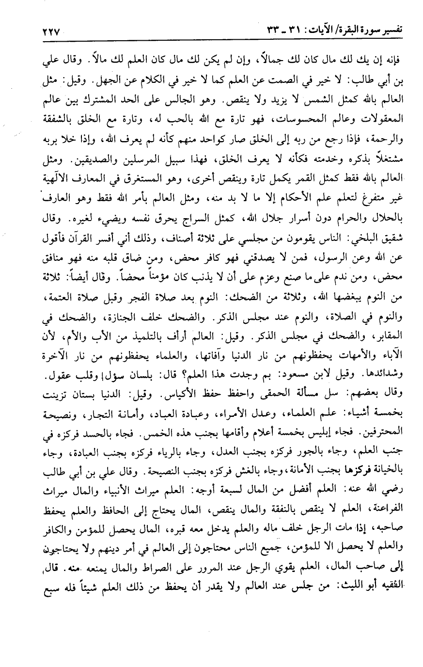 وقال علي بن أبي طالب رضي الله عنه: العلم أفضل من المال لسبعة أوجه: العلم ميراث الأنبياء والمال ميراث الفراعنة، العلم لا ينقص بالنفقة والمال ينقص، المال يحتاج إلى الحافظ والعلم يحفظ صاحبه، إذا مات الرجل خلف ماله والعلم يدخل معه قبره، المال يحصل للمؤمن والكافر والعلم لا يحصل الا للمؤمن، جميع الناس محتاجون إلى العالم في أمر دينهم ولا يحتاجون إلى صاحب المال، العلم يقوي الرجل عند المرور على الصراط والمال يمنعه منه.
