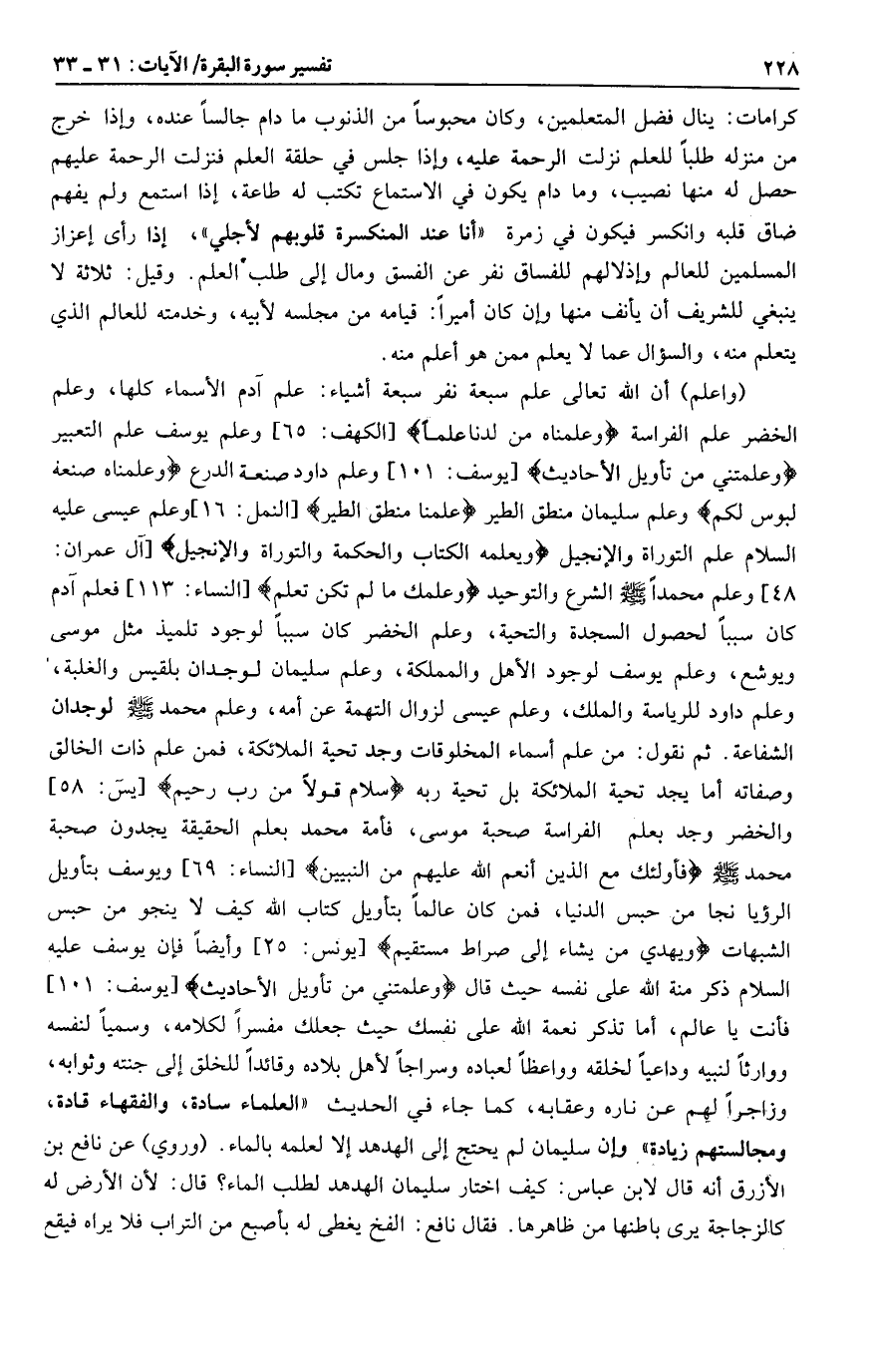 [النساء: 113] فعلم آدم كان سببا لحصول السجدة والتحية، وعلم الخضر كان سببا لوجود تلميذ مثل موسى ويوشع، وعلم يوسف لوجود الأهل والمملكة، وعلم سليمان لوجدان بلقيس والغلبة، وعلم داود للرياسة والملك، وعلم عيسى لزوال التهمة عن أمه، وعلم محمد صلى الله عليه وسلم لوجدان الشفاعة. ثم نقول: من علم أسماء المخلوقات وجد تحية الملائكة، فمن علم ذات الخالق وصفاته أما يجد تحية الملائكة بل تحية ربه سَلامٌ قَوْلًا مِنْ رَبٍّ رَحِيمٍ [يس: 58] والخضر وجد بعلم الفراسة صحبة موسى، فأمة محمد بعلم الحقيقة يجدون صحبة محمد صلى الله عليه وسلم فَأُولئِكَ مَعَ الَّذِينَ أَنْعَمَ اللَّهُ عَلَيْهِمْ مِنَ النَّبِيِّينَ [النساء: 69] ويوسف بتأويل الرؤيا نجا من حبس الدنيا، فمن كان عالما بتأويل كتاب الله كيف لا ينجو من حبس الشبهات وَيَهْدِي مَنْ يَشاءُ إِلى صِراطٍ مُسْتَقِيمٍ [يونس: 25] وأيضا فإن يوسف عليه السلام ذكر منة الله على نفسه حيث قال وَعَلَّمْتَنِي مِنْ تَأْوِيلِ الْأَحادِيثِ [يوسف: 101] فأنت يا عالم، أما تذكر نعمة الله على نفسك حيث جعلك مفسرا لكلامه، وسميا لنفسه ووارثا لنبيه وداعيا لخلقه وواعظا لعباده وسراجا لأهل بلاده وقائدا للخلق إلى جنته وثوابه، وزاجرا لهم عن ناره وعقابه، كما