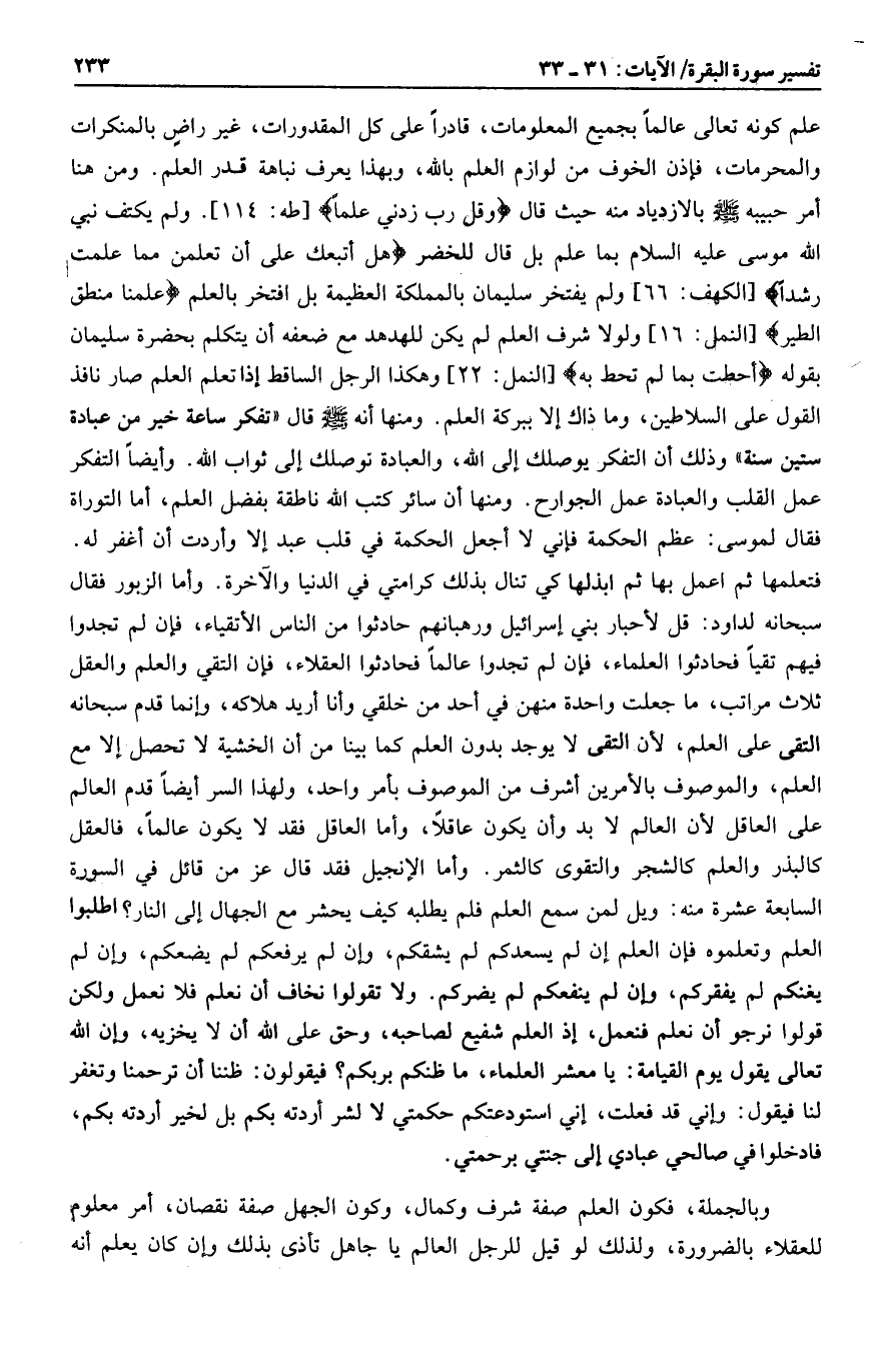 علم كونه تعالى عالما بجميع المعلومات، قادرا على كل المقدورات، غير راض بالمنكرات والمحرمات، فإذن الخوف من لوازم العلم بالله، وبهذا يعرف نباهة قدر العلم. ومن هنا أمر حبيبه صلى الله عليه وسلم بالازدياد منه حيث قال وَقُلْ رَبِّ زِدْنِي عِلْماً [طه: 114] . ولم يكتف نبي الله موسى عليه السلام بما علم بل قال للخضر هَلْ أَتَّبِعُكَ عَلى أَنْ تُعَلِّمَنِ مِمَّا عُلِّمْتَ رُشْداً