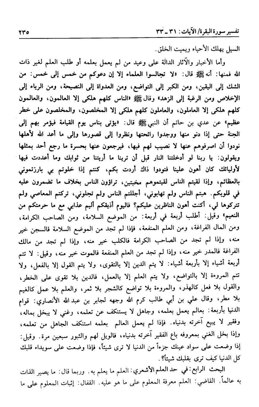 وقال صلى الله عليه وسلم «الناس كلهم هلكى إلا العالمون، والعالمون كلهم هلكى إلا العاملون، والعاملون كلهم هلكى إلا المخلصون، والمخلصون على خطر عظيم»