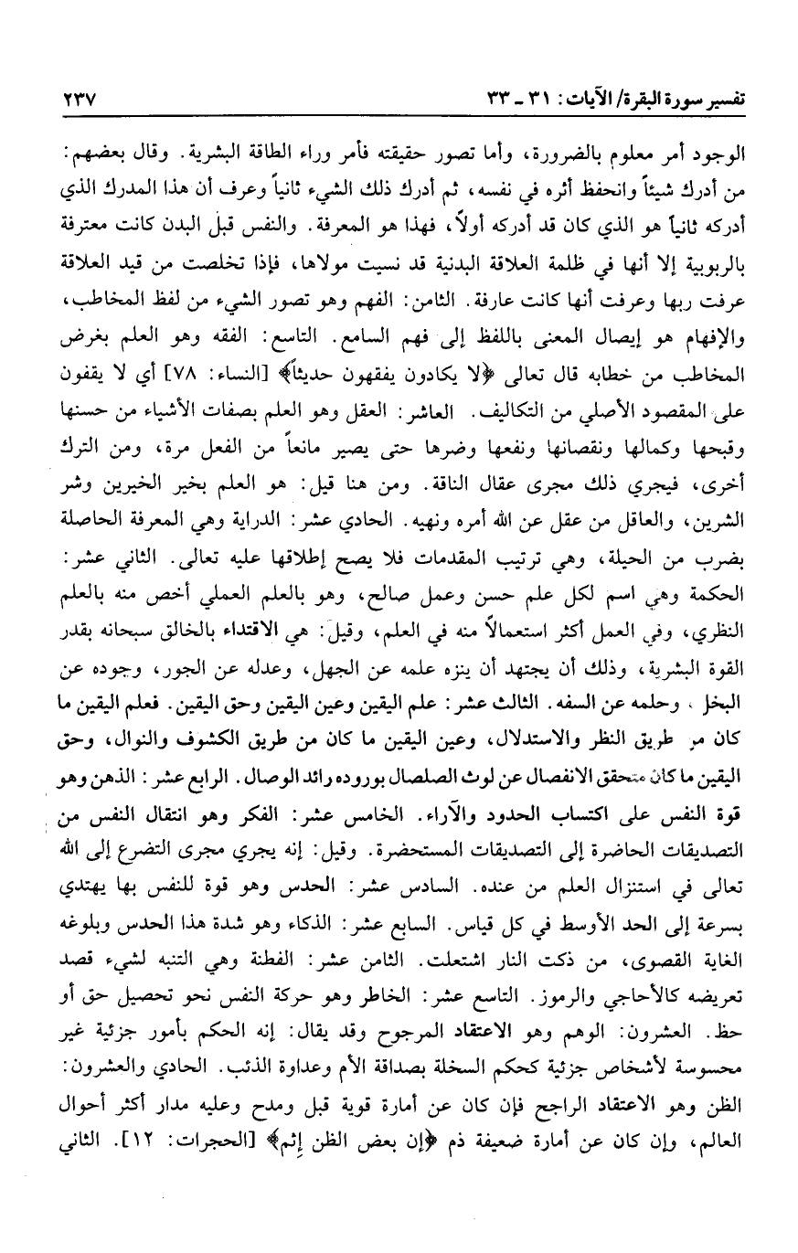 من أدرك شيئا وانحفظ أثره في نفسه، ثم أدرك ذلك الشيء ثانيا وعرف أن هذا هذا المدرك الذي أدركه ثانيا هو الذي كان قد أدركه أولا، فهذا هو المعرفة. والنفس قبل البدن كانت معترفة بالربوبية إلا أنها في ظلمة العلاقة البدنية قد نسيت مولاها، فإذا تخلصت من قيد العلاقة عرفت ربها وعرفت أنها كانت عارفة. الثامن: الفهم وهو تصور الشيء من لفظ المخاطب، والإفهام هو إيصال المعنى باللفظ إلى فهم السامع. التاسع: الفقه وهو العلم بغرض المخاطب من خطابه قال تعالى لا يَكادُونَ يَفْقَهُونَ حَدِيثاً [النساء: 78] أي لا يقفون على المقصود الأصلي من التكاليف. العاشر: العقل وهو العلم بصفات الأشياء من حسنها وقبحها وكمالها ونقصانها ونفعها وضرها حتى يصير مانعا من الفعل مرة، ومن الترك أخرى، فيجري ذلك مجرى عقال الناقة. ومن هنا قيل: هو العلم بخير الخيرين وشر الشرين، والعاقل من عقل عن الله أمره ونهيه. الحادي عشر: الدراية وهي المعرفة الحاصلة بضرب من الحيلة، وهي ترتيب المقدمات فلا يصح إطلاقها عليه تعالى. الثاني عشر: