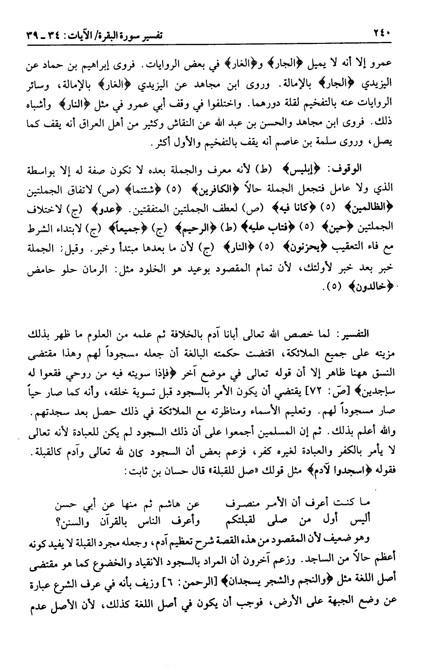 إِبْلِيسَ (ط) لأنه معرف والجملة بعده لا تكون صفة له إلا بواسطة الذي ولا عامل فتجعل الجملة حالا الْكافِرِينَ (هـ) شِئْتُما (ص) لاتفاق الجملتين الظَّالِمِينَ (هـ) كانا فِيهِ (ص) لعطف الجملتين المتفقتين. عَدُوٌّ (ج) لاختلاف الجملتين حِينٍ (هـ) فَتابَ عَلَيْهِ (ط) الرَّحِيمُ (ج) جَمِيعاً (ج) لابتداء الشرط مع فاء التعقيب يَحْزَنُونَ (هـ) النَّارِ (ج) لأن ما بعدها مبتدأ وخبر. وقيل: الجملة خبر بعد خبر لأولئك، لأن تمام المقصود بوعيد هو الخلود مثل: الرمان حلو حامض خالِدُونَ (هـ) .