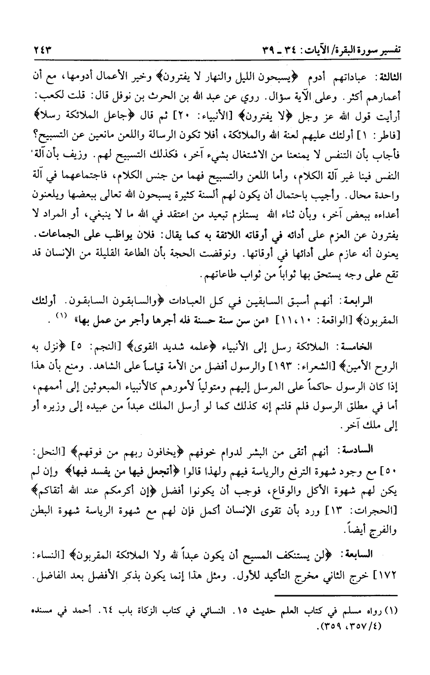 الثالثة: عباداتهم أدوم يُسَبِّحُونَ اللَّيْلَ وَالنَّهارَ لا يَفْتُرُونَ وخير الأعمال أدومها، مع أن أعمارهم أكثر. وعلى الآية سؤال. روي عن عبد الله بن الحرث بن نوفل قال: قلت لكعب: