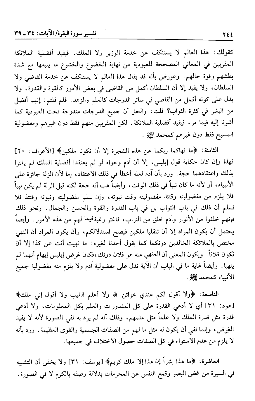 الثامنة: ما نَهاكُما رَبُّكُما عَنْ هذِهِ الشَّجَرَةِ إِلَّا أَنْ تَكُونا مَلَكَيْنِ [الأعراف: 20] فهذا وإن كان حكاية قول إبليس، إلا أن آدم وحواء لو لم يعتقدا أفضلية الملك لم يغترا بذلك واعتقادهما حجة. ورد بأن آدم لعله أخطأ في ذلك الاعتقاد، إما لأن الزلة جائزة على الأنبياء، أو لأنه ما كان نبيا في ذلك الوقت، وأيضا هب أنه حجة لكنه قبل الزلة لم يكن نبيا فلا يلزم من مفضوليته وقتئذ مفضوليته وقت نبوته، وإن سلم مفضوليته ونبوته وقتئذ فلا نسلم أن ذلك في باب الثواب بل في باب القدرة والقوة والحسن والجمال. ونحو ذلك فإنهم خلقوا من الأنوار وآدم خلق من التراب، فاغتر رغبة فيما لهم من هذه الأمور. وأيضا يحتمل أن يكون المراد إلا أن تنقلبا ملكين فيصح استدلالكم، وأن يكون المراد أن النهي مختص بالملائكة الخالدين دونكما كما يقول أحدنا لغيره: ما نهيت أنت عن كذا إلا أن تكون قلانا. ويكون المعنى أن المنهي عنه هو فلان دونك، فكان غرض إبليس إيهام أنهما لم ينهيا. وأيضا غاية ما في الباب أن الآية تدل على مفضولية آدم ولا يلزم منه مفضولية جميع الأنبياء كمحمد صلى الله عليه وسلم.
