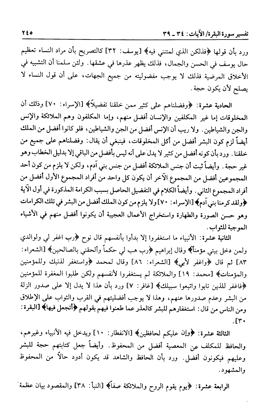 الحادية عشرة: وَفَضَّلْناهُمْ عَلى كَثِيرٍ مِمَّنْ خَلَقْنا تَفْضِيلًا [الإسراء: 70] وذلك أن المخلوقات إما غير المكلفين والإنسان أفضل منهم، وإما المكلفون وهم الملائكة والإنس والجن والشياطين. ولا ريب أن الإنس أفضل من الجن والشياطين، فلو كانوا أفضل من الملك أيضا لزم كون البشر أفضل من أكل المخلوقات، فينبغي أن يقال: وفضلناهم على جميع من خلقنا. ورد بأن كونه أفضل من كثير لا يدل على أنه ليس بأفضل من الباقي إلا بدليل الخطاب وهو غير حجة. وأيضا ثبت أن جنس الملائكة أفضل من جنس بني آدم، ولكن لا يلزم من كون أحد المجموعين أفضل من المجموع الآخر أن يكون كل واحد من أفراد المجموع الأول أفضل من أفراد المجموع الثاني. وأيضا الكلام في التفضيل الحاصل بسبب الكرامة المذكورة في أول الآية وَلَقَدْ كَرَّمْنا بَنِي آدَمَ [الإسراء: 70] ولا يلزم من كون الملك أفضل من البشر في تلك الكرامات وهو حسن الصورة والطهارة واستخراج الأعمال العجيبة أن يكونوا أفضل منهم في الأشياء الموجبة للثواب.