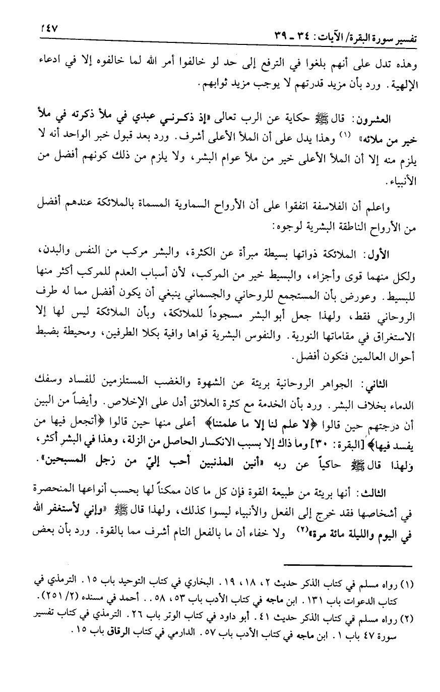 وهذا يدل على أن الملأ الأعلى أشرف. ورد بعد قبول خبر الواحد أنه لا يلزم منه إلا أن الملأ الأعلى خير من ملأ عوام البشر، ولا يلزم من ذلك كونهم أفضل من الأنبياء.