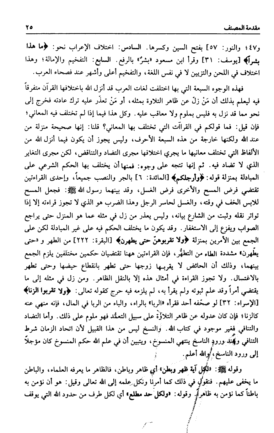 فهذه الوجوه السبعة التي بها اختلفت لغات العرب قد أنزل الله باختلافها القرآن متفرقا فيه ليعلم بذلك أن من زلّ عن ظاهر التلاوة بمثله، أو من تعذّر عليه ترك عادته فخرج إلى نحو مما قد نزل به فليس بملوم ولا معاقب عليه. وكل هذا فيما إذا لم تختلف فيه المعاني فإن قيل: فما قولكم في القراآت التي تختلف بها المعاني؟ قلنا: إنها صحيحة منزلة من عند الله ولكنها خارجة من هذه السبعة الأحرف، وليس يجوز أن يكون فيما أنزل الله من الألفاظ التي تختلف معانيها ما يجري اختلافها مجرى التضاد والتناقض، لكن مجرى التغاير الذي لا تضاد فيه. ثم إنها تتجه على وجوه: فمنها أن يختلف بها الحكم الشرعي على المبادلة بمنزلة قوله: وَأَرْجُلَكُمْ [المائدة: 6] بالجر والنصب جميعا، وإحدى القراءتين تقتضي فرض المسح والأخرى فرض الغسل، وقد بينهما رسول الله صلى الله عليه وسلم: فجعل المسح للابس الخف في وقته، والغسل لحاسر الرجل وهذا الضرب هو الذي لا تجوز قراءته إلا إذا تواتر نقله وثبت من الشارع بيانه، وليس يعذر من زل في مثله عما هو المنزل حتى يراجع الصواب ويفزع إلى الاستغفار. وقد يكون ما يختلف الحكم فيه على غير المبادلة لكن على الجمع بين الأمرين بمنزلة وَلا تَقْرَبُوهُنَّ حَتَّى يَطْهُرْنَ [البقرة: 222] من الطهر و «حتى يطّهرن» مشددة الطاء من التطهّر، فإن القراءتين هاهنا تقتضيان حكمين مختلفين يلزم الجمع بينهما، وذلك أن الحائض لا يقربها زوجها حتى تطهر بانقطاع حيضها وحتى تطهر بالاغتسال. ولا تجوز القراءة في أمثال هذه إلا بالنقل الظاهر. ومن زل في مثله إلى ما يقتضي أمرا وقد علم ثبوته ولم يقرأ به، لم يلزمه فيه حرج كقوله تعالى: وَلا تَقْرَبُوا الزِّنى [الإسراء: 32] لو صحّفه أحد فقرأه «الربا» بالراء، والباء من الربا في المال، فإنه منهي عنه كالزنا فإن كان عدوله عن ظاهر التلاوة على سبيل التعمّد فهو ملوم على ذلك. وأما التضاد والتنافي فغير موجود في كتاب الله. والنسخ ليس من هذا القبيل لأن اتحاد الزمان شرط التنافي وعند ورود الناسخ ينتهي المنسوخ، ويتبين أن في علم الله حكم المنسوخ كان مؤجلا إلى ورود الناسخ، والله أعلم.
