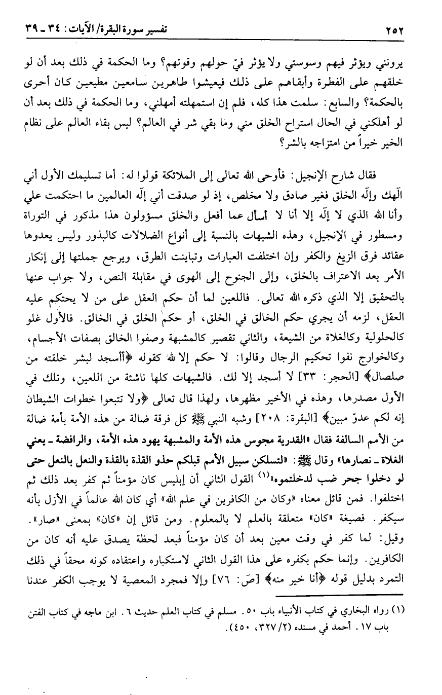 فقال شارح الإنجيل: فأوحى الله تعالى إلى الملائكة قولوا له: أما تسليمك الأول أني إلهك وإله الخلق فغير صادق ولا مخلص، إذ لو صدقت أني إله العالمين ما احتكمت علي وأنا الله الذي لا إله إلا أنا لا أسأل عما أفعل والخلق مسؤولون هذا مذكور في التوراة ومسطور في الإنجيل، وهذه الشبهات بالنسبة إلى أنواع الضلالات كالبذور وليس يعدوها عقائد فرق الزيغ والكفر وإن اختلفت العبارات وتباينت الطرق، ويرجع جملتها إلى إنكار الأمر بعد الاعتراف بالخلق، وإلى الجنوح إلى الهوى في مقابلة النص، ولا جواب عنها بالتحقيق إلا الذي ذكره الله تعالى. فاللعين لما أن حكم العقل على من لا يحتكم عليه العقل، لزمه أن يجري حكم الخالق في الخلق، أو حكم الخلق في الخالق. فالأول غلو كالحلولية وكالغلاة من الشيعة، والثاني تقصير كالمشبهة وصفوا الخالق بصفات الأجسام، وكالخوارج نفوا تحكيم الرجال وقالوا: لا حكم إلا لله كقوله لِأَسْجُدَ لِبَشَرٍ خَلَقْتَهُ مِنْ صَلْصالٍ [الحجر: 33] لا أسجد إلا لك. فالشبهات كلها ناشئة من اللعين، وتلك في الأول مصدرها، وهذه في الأخير مظهرها، ولهذا قال تعالى وَلا تَتَّبِعُوا خُطُواتِ الشَّيْطانِ إِنَّهُ لَكُمْ عَدُوٌّ مُبِينٌ [البقرة: 208]