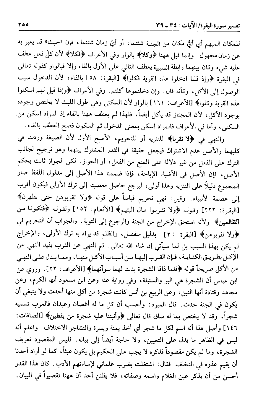[الأنعام: 152] ولقوله فَتَكُونا مِنَ الظَّالِمِينَ ولأنه استحق الإخراج من الجنة والرجوع إلى التوبة. والجواب أن التحريم في وَلا تَقْرَبُوهُنَّ [البقرة: 2] بدليل منفصل، والظلم قد يراد به ترك الأولى، والإخراج لم يكن بهذا السبب بل لما سيأتي إن شاء الله تعالى. ثم النهي عن القرب يفيد النهي عن الأكل بطريق الكناية، فإن القرب إليها من أسباب الأكل منها، ومما يدل على النهي عن الأكل صريحا قوله فَلَمَّا ذاقَا الشَّجَرَةَ بَدَتْ لَهُما سَوْآتُهُما [الأعراف: 22] . وروي عن ابن عباس أن الشجرة هي البر والسنبلة، وفي رواية عنه وعن ابن مسعود أنها الكرم، وعن مجاهد وقتادة أنها التين، وعن الربيع بن أنس كانت شجرة من أكل منها أحدث ولا ينبغي أن يكون في الجنة حدث. قال المبرد: وأحسب أن كل ما له أغصان وعيدان فالعرب تسميه شجرا، وقد لا يختص بما له ساق قال تعالى وَأَنْبَتْنا عَلَيْهِ شَجَرَةً مِنْ يَقْطِينٍ [الصافات: