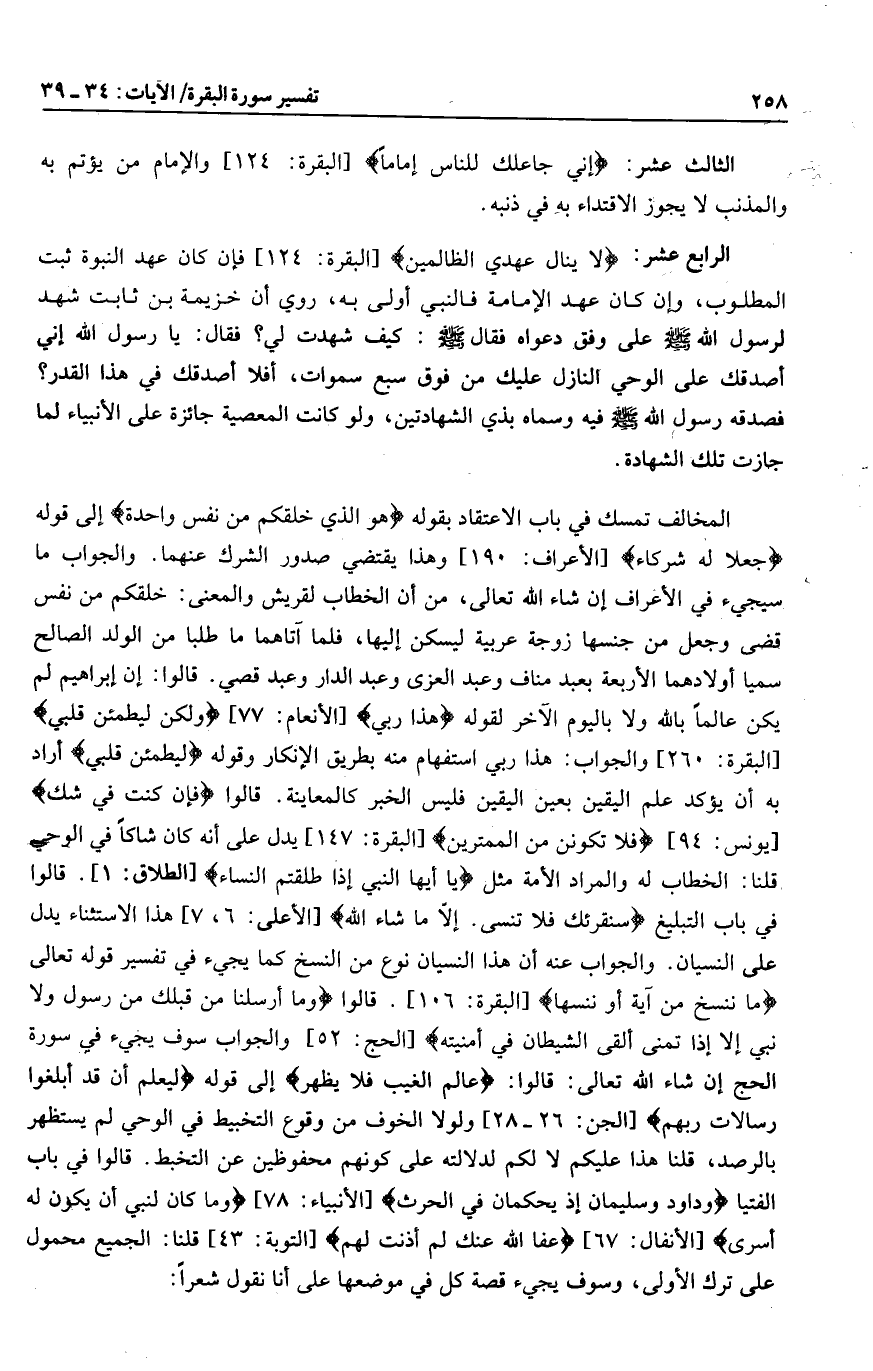 المخالف تمسك في باب الاعتقاد بقوله هُوَ الَّذِي خَلَقَكُمْ مِنْ نَفْسٍ واحِدَةٍ إلى قوله جَعَلا لَهُ شُرَكاءَ [الأعراف: 190] وهذا يقتضي صدور الشرك عنهما. والجواب ما سيجيء في الأعراف إن شاء الله تعالى، من أن الخطاب لقريش والمعنى: خلقكم من نفس قضى وجعل من جنسها زوجة عربية ليسكن إليها، فلما آتاهما ما طلبا من الولد الصالح سميا أولادهما الأربعة بعبد مناف وعبد العزى وعبد الدار وعبد قصي. قالوا: إن إبراهيم لم يكن عالما بالله ولا باليوم الآخر لقوله هذا رَبِّي [الأنعام: 77] وَلكِنْ لِيَطْمَئِنَّ قَلْبِي [البقرة: 260] والجواب: هذا ربي استفهام منه بطريق الإنكار وقوله لِيَطْمَئِنَّ قَلْبِي أراد به أن يؤكد علم اليقين بعين اليقين فليس الخبر كالمعاينة. قالوا فَإِنْ كُنْتَ فِي شَكٍّ [يونس: 94] فَلا تَكُونَنَّ مِنَ الْمُمْتَرِينَ [البقرة: 147] يدل على أنه كان شاكا في الوحي قلنا: الخطاب له والمراد الأمة مثل يا أَيُّهَا النَّبِيُّ إِذا طَلَّقْتُمُ النِّساءَ [الطلاق: 1] . قالوا في باب التبليغ سَنُقْرِئُكَ فَلا تَنْسى. إِلَّا ما شاءَ اللَّهُ [الأعلى: 6، 7] هذا الاستثناء يدل على النسيان. والجواب عنه أن هذا النسيان نوع من النسخ كما يجيء في تفسير قوله تعالى ما نَنْسَخْ مِنْ آيَةٍ أَوْ نُنْسِها [البقرة: 106] . قالوا وَما أَرْسَلْنا مِنْ قَبْلِكَ مِنْ رَسُولٍ وَلا نَبِيٍّ إِلَّا إِذا تَمَنَّى أَلْقَى الشَّيْطانُ فِي أُمْنِيَّتِهِ [الحج: 52] والجواب سوف يجيء في سورة الحج إن شاء الله تعالى: قالوا: عالِمُ الْغَيْبِ فَلا يُظْهِرُ إلى قوله لِيَعْلَمَ أَنْ قَدْ أَبْلَغُوا رِسالاتِ رَبِّهِمْ [الجن: 26- 28] ولولا الخوف من وقوع التخبيط في الوحي لم يستظهر بالرصد، قلنا هذا عليكم لا لكم لدلالته على كونهم محفوظين عن التخبط. قالوا في باب الفتيا وَداوُدَ وَسُلَيْمانَ إِذْ يَحْكُمانِ فِي الْحَرْثِ [الأنبياء: 78] وما كانَ لِنَبِيٍّ أَنْ يَكُونَ لَهُ أَسْرى [الأنفال: 67] عَفَا اللَّهُ عَنْكَ لِمَ أَذِنْتَ لَهُمْ [التوبة: 43] قلنا: الجميع محمول على ترك الأولى، وسوف يجيء قصة كل في موضعها على أنا نقول شعرا:
