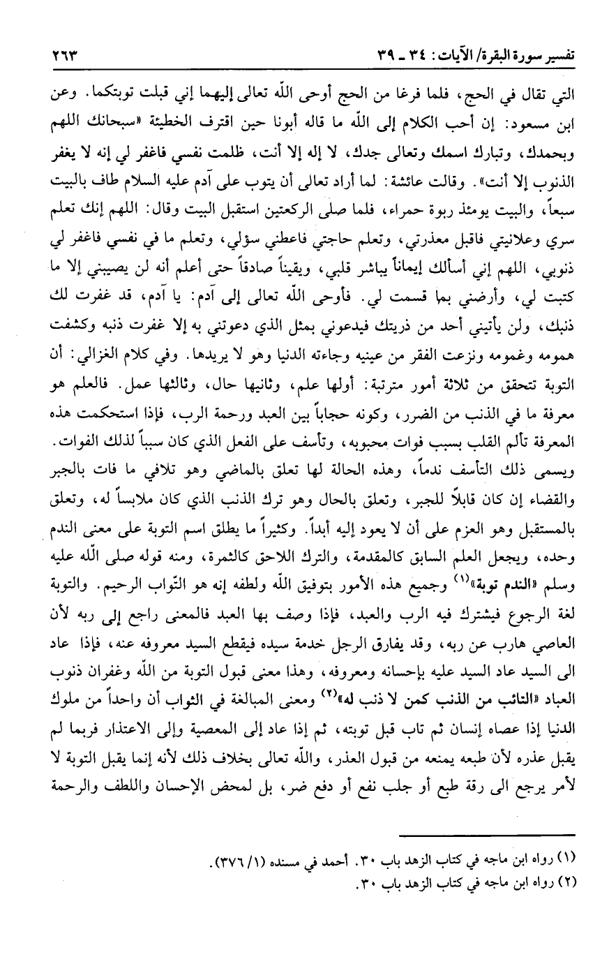 التي تقال في الحج، فلما فرغا من الحج أوحى الله تعالى إليهما إني قبلت توبتكما. وعن ابن مسعود: إن أحب الكلام إلى الله ما قاله أبونا حين اقترف الخطيئة «سبحانك اللهم وبحمدك، وتبارك اسمك وتعالى جدك، لا إله إلا أنت، ظلمت نفسي فاغفر لي إنه لا يغفر الذنوب إلا أنت» . وقالت عائشة: لما أراد تعالى أن يتوب على آدم عليه السلام طاف بالبيت سبعا، والبيت يومئذ ربوة حمراء، فلما صلى الركعتين استقبل البيت وقال: اللهم إنك تعلم سري وعلانيتي فاقبل معذرتي، وتعلم حاجتي فاعطني سؤلي، وتعلم ما في نفسي فاغفر لي ذنوبي، اللهم إني أسألك إيمانا يباشر قلبي، ويقينا صادقا حتى أعلم أنه لن يصيبني إلا ما كتبت لي، وأرضني بما قسمت لي. فأوحى الله تعالى إلى آدم: يا آدم، قد غفرت لك ذنبك، ولن يأتيني أحد من ذريتك فيدعوني بمثل الذي دعوتني به إلا غفرت ذنبه وكشفت همومه وغمومه ونزعت الفقر من عينيه وجاءته الدنيا وهو لا يريدها. وفي كلام الغزالي: أن التوبة تتحقق من ثلاثة أمور مترتبة: أولها علم، وثانيها حال، وثالثها عمل. فالعلم هو معرفة ما في الذنب من الضرر، وكونه حجابا بين العبد ورحمة الرب، فإذا استحكمت هذه المعرفة تألم القلب بسبب فوات محبوبه، وتأسف على الفعل الذي كان سببا لذلك الفوات.