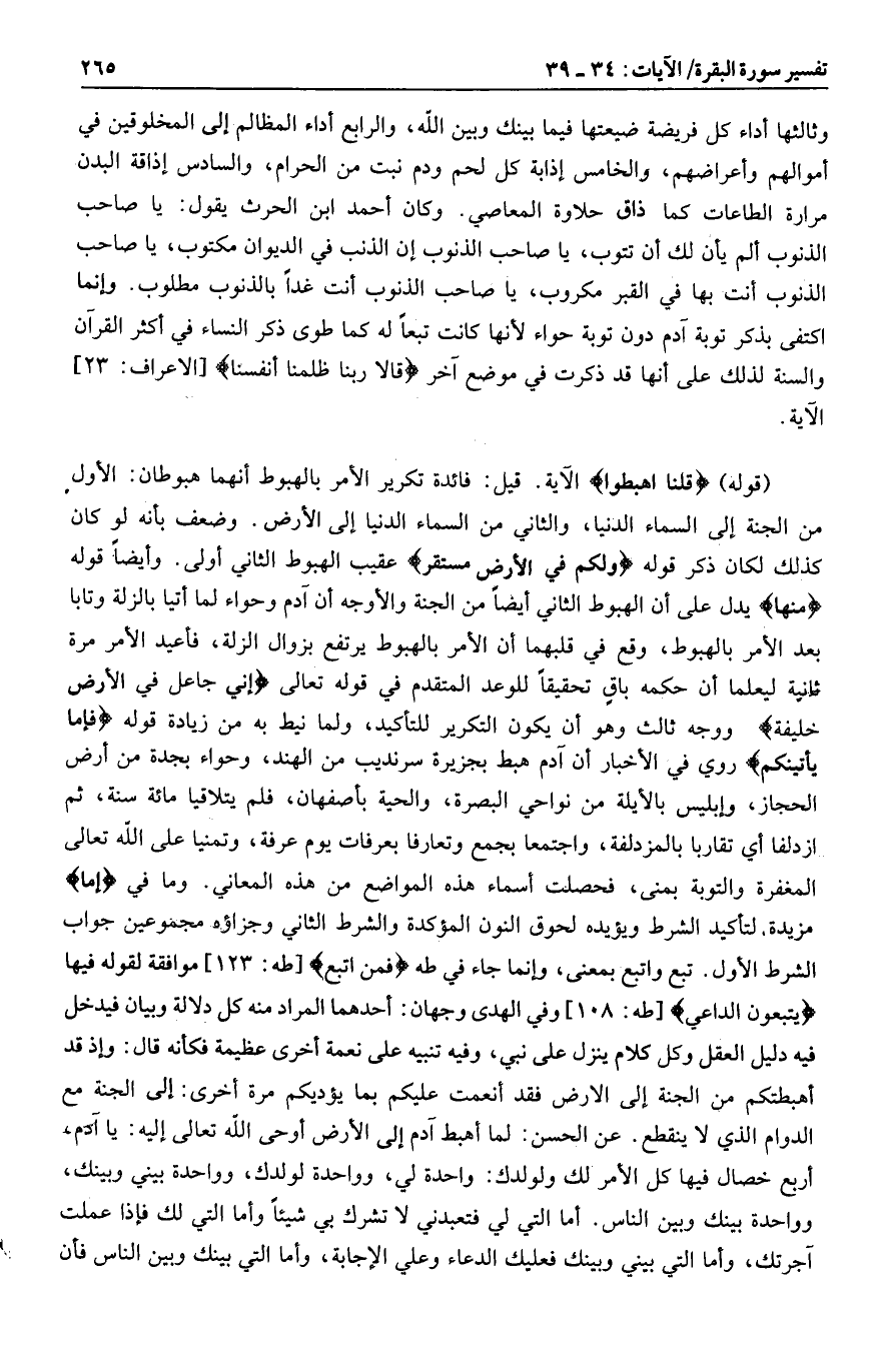 (قوله) قُلْنَا اهْبِطُوا الآية. قيل: فائدة تكرير الأمر بالهبوط أنهما هبوطان: الأول من الجنة إلى السماء الدنيا، والثاني من السماء الدنيا إلى الأرض. وضعف بأنه لو كان كذلك لكان ذكر قوله وَلَكُمْ فِي الْأَرْضِ مُسْتَقَرٌّ عقيب الهبوط الثاني أولى. وأيضا قوله مِنْها يدل على أن الهبوط الثاني أيضا من الجنة والأوجه أن آدم وحواء لما أتيا بالزلة وتابا بعد الأمر بالهبوط، وقع في قلبهما أن الأمر بالهبوط يرتفع بزوال الزلة، فأعيد الأمر مرة ثانية ليعلما أن حكمه باق تحقيقا للوعد المتقدم في قوله تعالى إِنِّي جاعِلٌ فِي الْأَرْضِ خَلِيفَةً ووجه ثالث وهو أن يكون التكرير للتأكيد، ولما نيط به من زيادة قوله فَإِمَّا يَأْتِيَنَّكُمْ