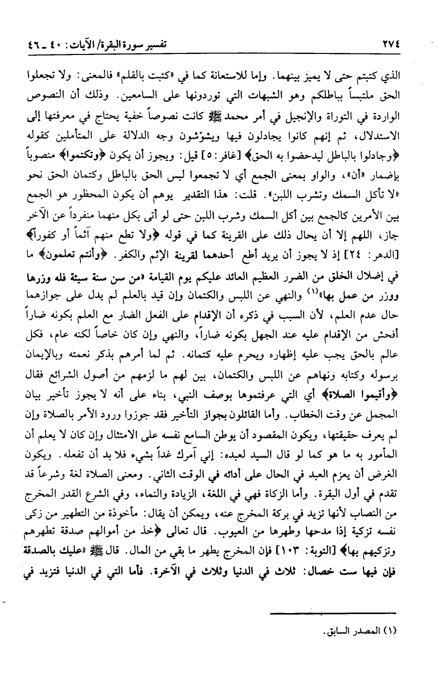 والنهي عن اللبس والكتمان وإن قيد بالعلم لم يدل على جوازهما حال عدم العلم، لأن السبب في ذكره أن الإقدام على الفعل الضار مع العلم بكونه ضارا أفحش من الإقدام عليه عند الجهل بكونه ضارا، والنهي وإن كان خاصا لكنه عام، فكل عالم بالحق يجب عليه إظهاره ويحرم عليه كتمانه. ثم لما أمرهم بذكر نعمته وبالإيمان برسوله وكتابه ونهاهم عن اللبس والكتمان، بين لهم ما لزمهم من أصول الشرائع فقال وَأَقِيمُوا الصَّلاةَ أي التي عرفتموها بوصف النبي، بناء على أنه لا يجوز تأخير بيان المجمل عن وقت الخطاب. وأما القائلون بجواز التأخير فقد جوزوا ورود الأمر بالصلاة وإن لم يعرف حقيقتها، ويكون المقصود أن يوطن السامع نفسه على الامتثال وإن كان لا يعلم أن المأمور به ما هو كما لو قال السيد لعبده: إني آمرك غدا بشيء فلا بد أن تفعله. ويكون الغرض أن يعزم العبد في الحال على أدائه في الوقت الثاني. ومعنى الصلاة لغة وشرعا قد تقدم في أول البقرة. وأما الزكاة فهي في اللغة، الزيادة والنماء، وفي الشرع القدر المخرج من النصاب لأنها تزيد في بركة المخرج عنه، ويمكن أن يقال: مأخوذة من التطهير من زكى نفسه تزكية إذا مدحها وطهرها من العيوب. قال تعالى خُذْ مِنْ أَمْوالِهِمْ صَدَقَةً تُطَهِّرُهُمْ وَتُزَكِّيهِمْ بِها [التوبة: 103] فإن المخرج يطهر ما بقي من المال.