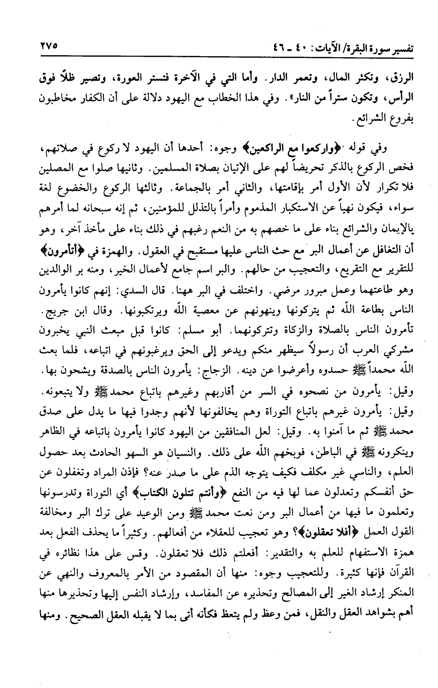 وفي قوله وَارْكَعُوا مَعَ الرَّاكِعِينَ وجوه: أحدها أن اليهود لا ركوع في صلاتهم، فخص الركوع بالذكر تحريضا لهم على الإتيان بصلاة المسلمين. وثانيها صلوا مع المصلين فلا تكرار لأن الأول أمر بإقامتها، والثاني أمر بالجماعة. وثالثها الركوع والخضوع لغة سواء، فيكون نهيا عن الاستكبار المذموم وأمرا بالتذلل للمؤمنين، ثم إنه سبحانه لما أمرهم بالإيمان والشرائع بناء على ما خصهم به من النعم رغبهم في ذلك بناء على مأخذ آخر، وهو أن التغافل عن أعمال البر مع حث الناس عليها مستقبح في العقول. والهمزة في أَتَأْمُرُونَ للتقرير مع التقريع، والتعجيب من حالهم. والبر اسم جامع لأعمال الخير، ومنه بر الوالدين وهو طاعتهما وعمل مبرور مرضي. واختلف في البر هاهنا. قال السدي: إنهم كانوا يأمرون الناس بطاعة الله ثم يتركونها وينهونهم عن معصية الله ويرتكبونها. وقال ابن جريج.