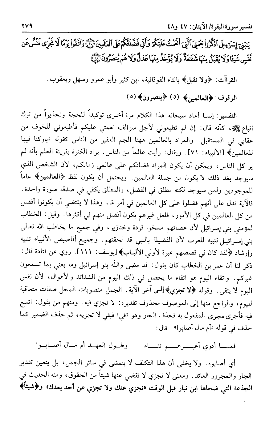 ذكر لنا أن عمر بن الخطاب كان يقول: قد مضى والله بنو إسرائيل وما يعني بما تسمعون غيركم. واتقاء اليوم هو اتقاء ما يحصل في ذلك اليوم من الشدائد والأهوال، لأن نفس اليوم لا يتقى. وقوله لا تَجْزِي إلى آخر الآية. الجمل منصوبات المحل صفات متعاقبة لليوم، والراجع منها إلى الموصوف محذوف تقديره: لا تجزي فيه. ومنهم من يقول: اتسع فيه فأجرى مجرى المفعول به فحذف الجار وهو «في» فبقي لا تجزيه، ثم حذف الضمير كما حذف في قوله «أم مال أصابوا» قال: