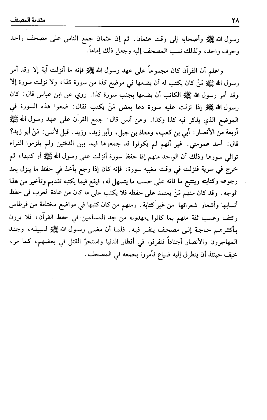 قال: أحد عمومتي. غير أنهم لم يكونوا قد جمعوها فيما بين الدفتين ولم يلزموا القراء توالي سورها وذلك أن الواحد منهم إذا حفظ سورة أنزلت على رسول الله صلى الله عليه وسلم أو كتبها، ثم خرج في سرية فنزلت في وقت مغيبه سورة، فإنه كان إذا رجع يأخذ في حفظ ما ينزل بعد رجوعه وكتابته ويتتبع ما فاته على حسب ما يتسهل له، فيقع فيما يكتبه تقديم وتأخير من هذا الوجه. وقد كان منهم من يعتمد على حفظه فلا يكتب على ما كان من عادة العرب في حفظ أنسابها وأشعار شعرائها من غير كتابة. ومنهم من كان كتبها في مواضع مختلفة من قرطاس وكتف وعسب ثقة منهم بما كانوا يعهدونه من جد المسلمين في حفظ القرآن، فلا يرون بأكثرهم حاجة إلى مصحف ينظر فيه. فلما أن مضى رسول الله صلى الله عليه وسلم لسبيله، وجند المهاجرون والأنصار أجنادا فتفرقوا في أقطار الدنيا واستحرّ القتل في بعضهم، كما مر، خيف حينئذ أن يتطرق إليه ضياع فأمروا بجمعه في المصحف.