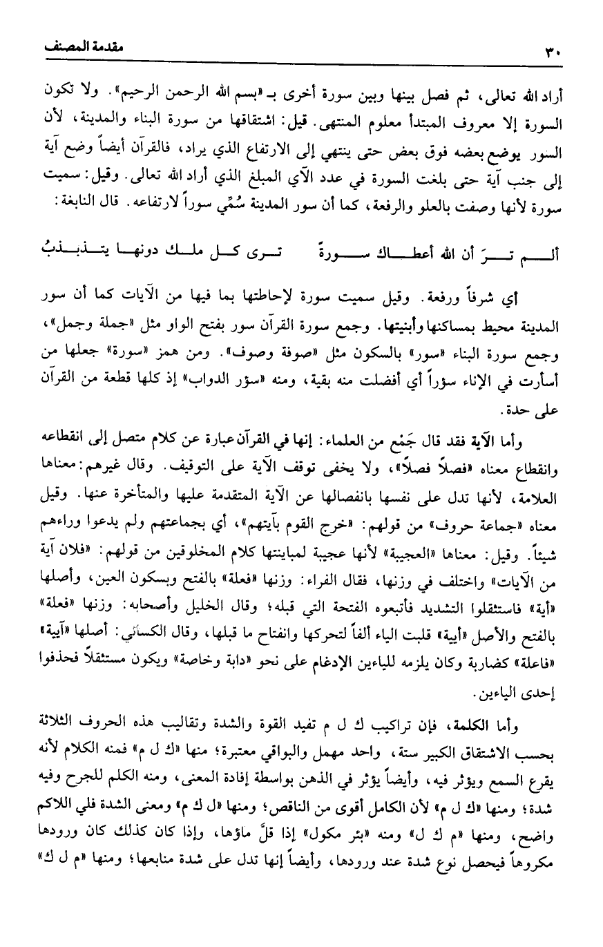 أراد الله تعالى، ثم فصل بينها وبين سورة أخرى ب «بسم الله الرحمن الرحيم» . ولا تكون السورة إلا معروف المبتدأ معلوم المنتهى. قيل: اشتقاقها من سورة البناء والمدينة، لأن السور يوضع بعضه فوق بعض حتى ينتهي إلى الارتفاع الذي يراد، فالقرآن أيضا وضع آية إلى جنب آية حتى بلغت السورة في عدد الآي المبلغ الذي أراد الله تعالى. وقيل: سميت سورة لأنها وصفت بالعلو والرفعة، كما أن سور المدينة سمّي سورا لارتفاعه. قال النابغة: