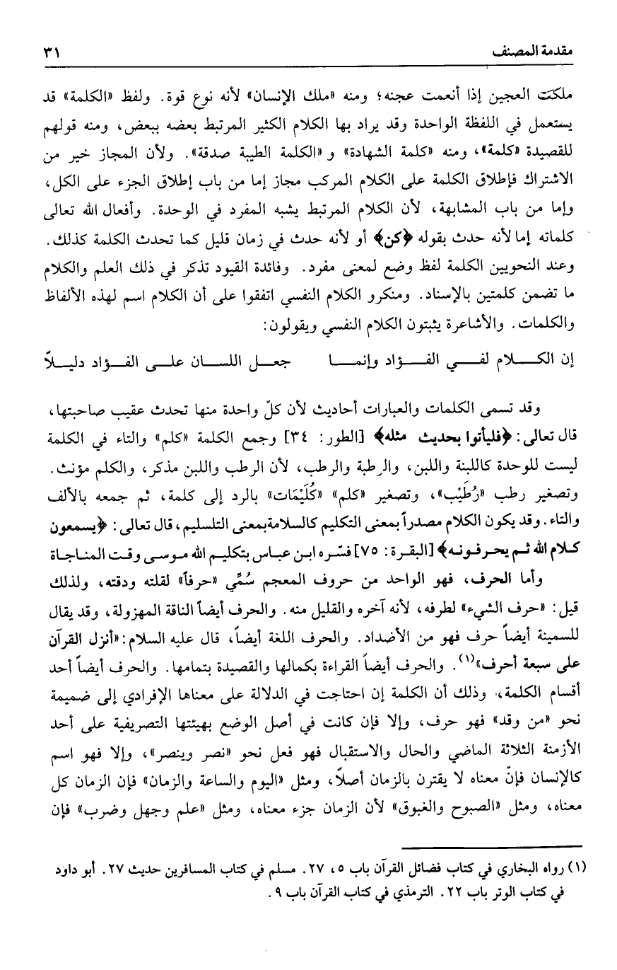 وعند النحويين الكلمة لفظ وضع لمعنى مفرد. وفائدة القيود تذكر في ذلك العلم والكلام ما تضمن كلمتين بالإسناد. ومنكر والكلام النفسي اتفقوا على أن الكلام اسم لهذه الألفاظ والكلمات. والأشاعرة يثبتون الكلام النفسي ويقولون: