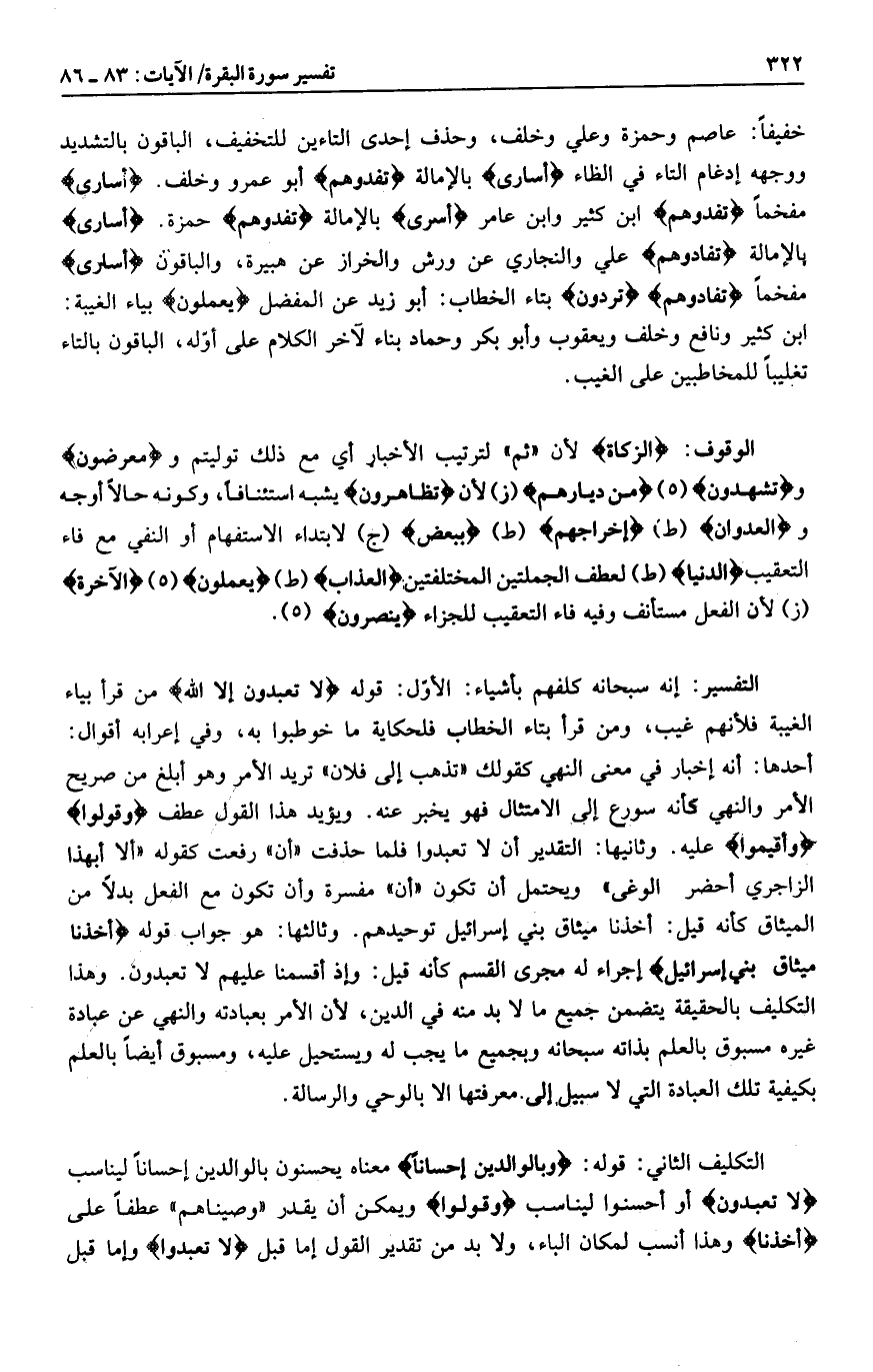 التكليف الثاني: قوله: وَبِالْوالِدَيْنِ إِحْساناً معناه يحسنون بالوالدين إحسانا ليناسب لا تَعْبُدُونَ أو أحسنوا ليناسب وَقُولُوا ويمكن أن يقدر «وصيناهم» عطفا على أَخَذْنا وهذا أنسب لمكان الباء، ولا بد من تقدير القول إما قبل لا تَعْبُدُونَ وإما قبل