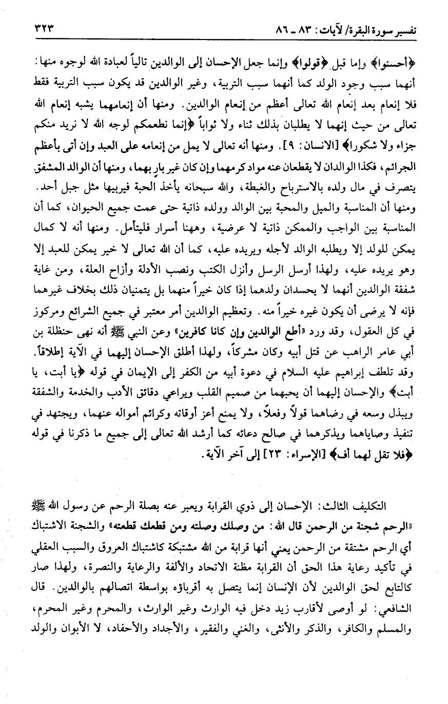 والشجنة الاشتباك أي الرحم مشتقة من الرحمن يعني أنها قرابة من الله مشتبكة كاشتباك العروق والسبب العقلي في تأكيد رعاية هذا الحق أن القرابة مظنة الاتحاد والألفة والرعاية والنصرة، ولهذا صار كالتابع لحق الوالدين لأن الإنسان إنما يتصل به أقرباؤه بواسطة اتصالهم بالوالدين. قال الشافعي: لو أوصى لأقارب زيد دخل فيه الوارث وغير الوارث، والمحرم وغير المحرم، والمسلم والكافر، والذكر والأنثى، والغني والفقير، والأجداد والأحفاد، لا الأبوان والولد