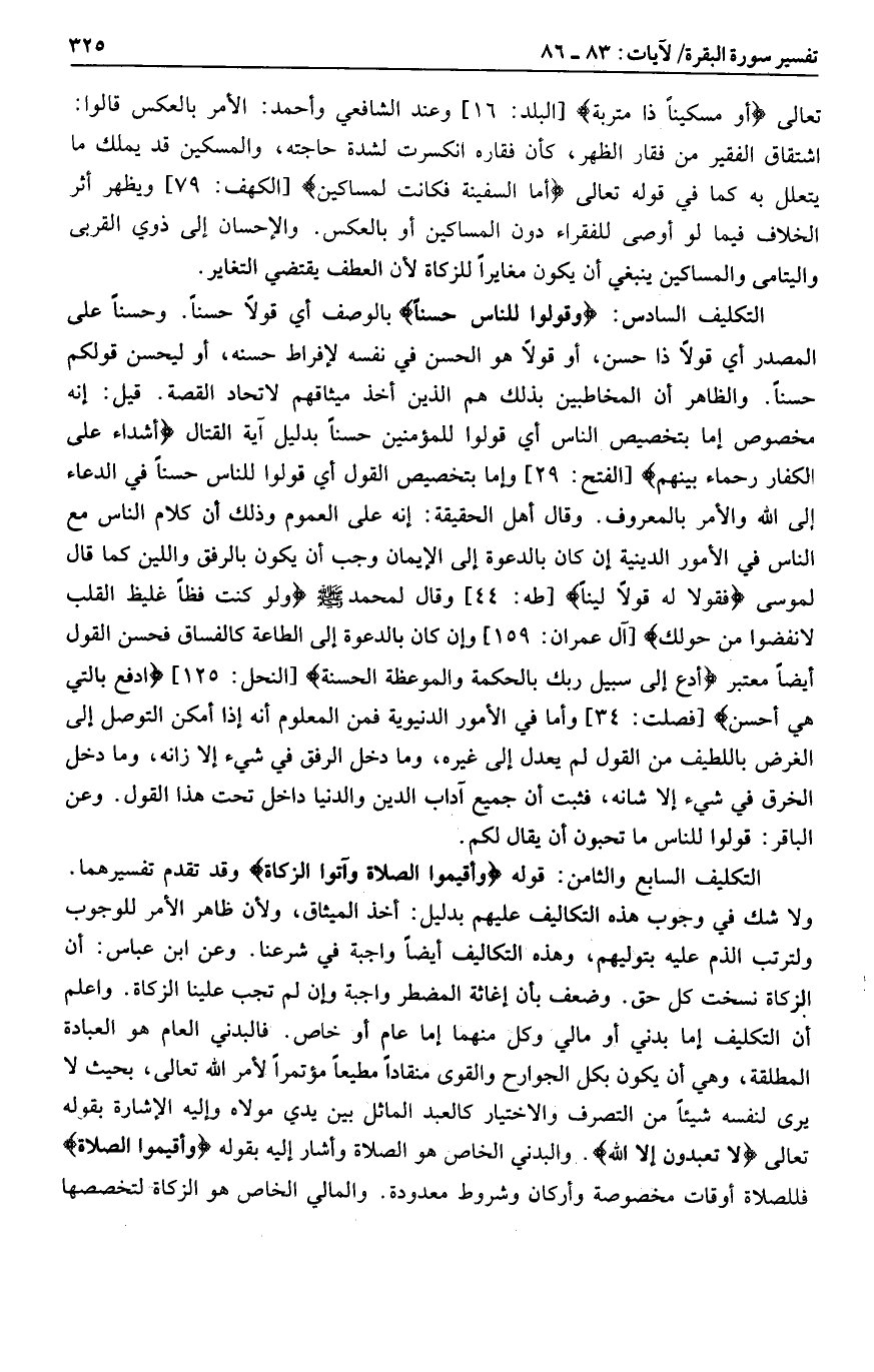 ولا شك في وجوب هذه التكاليف عليهم بدليل: أخذ الميثاق، ولأن ظاهر الأمر للوجوب ولترتب الذم عليه بتوليهم، وهذه التكاليف أيضا واجبة في شرعنا. وعن ابن عباس: أن الزكاة نسخت كل حق. وضعف بأن إغاثة المضطر واجبة وإن لم تجب علينا الزكاة. واعلم أن التكليف إما بدني أو مالي وكل منهما إما عام أو خاص. فالبدني العام هو العبادة المطلقة، وهي أن يكون بكل الجوارح والقوى منقادا مطيعا مؤتمرا لأمر الله تعالى، بحيث لا يرى لنفسه شيئا من التصرف والاختيار كالعبد الماثل بين يدي مولاه وإليه الإشارة بقوله تعالى لا تَعْبُدُونَ إِلَّا اللَّهَ. والبدني الخاص هو الصلاة وأشار إليه بقوله وَأَقِيمُوا الصَّلاةَ فللصلاة أوقات مخصوصة وأركان وشروط معدودة. والمالي الخاص هو الزكاة لتخصصها