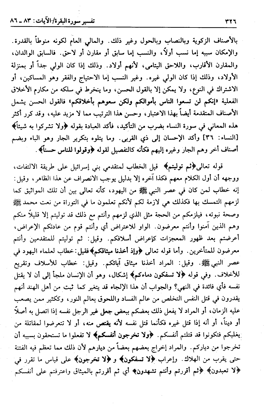 إنه خطاب لمن كان في عصر النبي صلى الله عليه وسلم من اليهود، كأنه تعالى بين أن تلك المواثيق كما لزمهم التمسك بها فكذلك هي لازمة لكم لأنكم تعلمون ما في التوراة من نعت محمد صلى الله عليه وسلم وصحة نبوته، فيلزمكم من الحجة مثل الذي لزمهم وأنتم مع ذلك قد توليتم إلا قليلا منكم وهم الذين آمنوا وأنتم معرضون. الواو للاعتراض أي وأنتم قوم من عادتكم الإعراض، أعرضتم بعد ظهور المعجزات كإعراض أسلافكم. وقيل: ثم توليتم للمتقدمين وأنتم معرضون للمتأخرين. وأما قوله تعالى وَإِذْ أَخَذْنا مِيثاقَكُمْ فقيل: خطاب لعلماء اليهود في عصر النبي صلى الله عليه وسلم. وقيل: المراد أخذنا ميثاق آبائكم. وقيل: خطاب للأسلاف وتقريع للأخلاف. وفي قوله لا تَسْفِكُونَ دِماءَكُمْ إشكال، وهو أن الإنسان ملجأ إلى أن لا يقتل نفسه فأي فائدة في النهي؟ والجواب أن هذا الإلجاء قد يتغير كما ثبت من أهل الهند أنهم يقدرون في قتل النفس التخلص من عالم الفساد واللحوق بعالم النور، وككثير ممن يصعب عليه الزمان، أو المراد لا يفعل ذلك بعضكم ببعض جعل غير الرجل نفسه إذا اتصل به أصلا أو دينا، أو أنه إذا قتل غيره فكأنما قتل نفسه لأنه يقتص منه، أو لا تتعرضوا لمقاتلة من يغلبكم فتكونوا قد قتلتم أنفسكم. وَلا تُخْرِجُونَ أَنْفُسَكُمْ لا تفعلوا ما تستحقون بسببه أن تخرجوا من دياركم. والمراد إخراج بعضهم بعضا من ديارهم لأن ذلك مما تعظم فيه الفتنة حتى يقرب من الهلاك. وإعراب لا تَسْفِكُونَ ولا تُخْرِجُونَ على قياس ما تقرر في لا تَعْبُدُونَ ثُمَّ أَقْرَرْتُمْ وَأَنْتُمْ تَشْهَدُونَ أي ثم أقررتم بالميثاق واعترفتم على أنفسكم