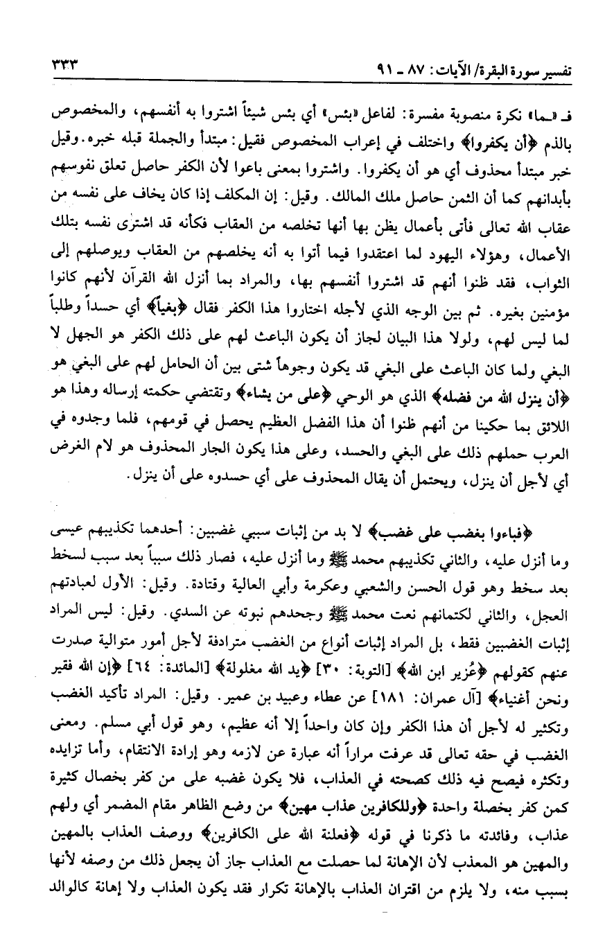 ف «ما» نكرة منصوبة مفسرة: لفاعل «بئس» أي بئس شيئا اشتروا به أنفسهم، والمخصوص بالذم أَنْ يَكْفُرُوا واختلف في إعراب المخصوص فقيل: مبتدأ والجملة قبله خبره. وقيل خبر مبتدأ محذوف أي هو أن يكفروا. واشتروا بمعنى باعوا لأن الكفر حاصل تعلق نفوسهم بأبدانهم كما أن الثمن حاصل ملك المالك. وقيل: إن المكلف إذا كان يخاف على نفسه من عقاب الله تعالى فأتى بأعمال يظن بها أنها تخلصه من العقاب فكأنه قد اشترى نفسه بتلك الأعمال، وهؤلاء اليهود لما اعتقدوا فيما أتوا به أنه يخلصهم من العقاب ويوصلهم إلى الثواب، فقد ظنوا أنهم قد اشتروا أنفسهم بها، والمراد بما أنزل الله القرآن لأنهم كانوا مؤمنين بغيره. ثم بين الوجه الذي لأجله اختاروا هذا الكفر فقال بَغْياً أي حسدا وطلبا لما ليس لهم، ولولا هذا البيان لجاز أن يكون الباعث لهم على ذلك الكفر هو الجهل لا البغي ولما كان الباعث على البغي قد يكون وجوها شتى بين أن الحامل لهم على البغي هو أَنْ يُنَزِّلَ اللَّهُ مِنْ فَضْلِهِ الذي هو الوحي عَلى مَنْ يَشاءُ وتقتضي حكمته إرساله وهذا هو اللائق بما حكينا من أنهم ظنوا أن هذا الفضل العظيم يحصل في قومهم، فلما وجدوه في العرب حملهم ذلك على البغي والحسد، وعلى هذا يكون الجار المحذوف هو لام الغرض أي لأجل أن ينزل، ويحتمل أن يقال المحذوف على أي حسدوه على أن ينزل.