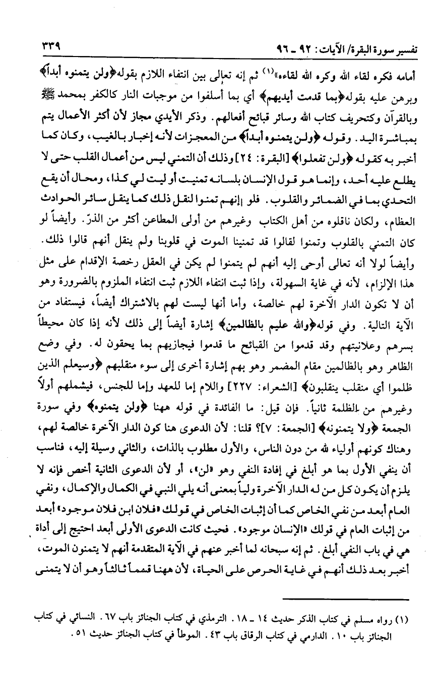 هي في باب النفي أبلغ. ثم إنه سبحانه لما أخبر عنهم في الآية المتقدمة أنهم لا يتمنون الموت، أخبر بعد ذلك أنهم في غاية الحرص على الحياة، لأن هاهنا قسما ثالثا وهو أن لا يتمنى