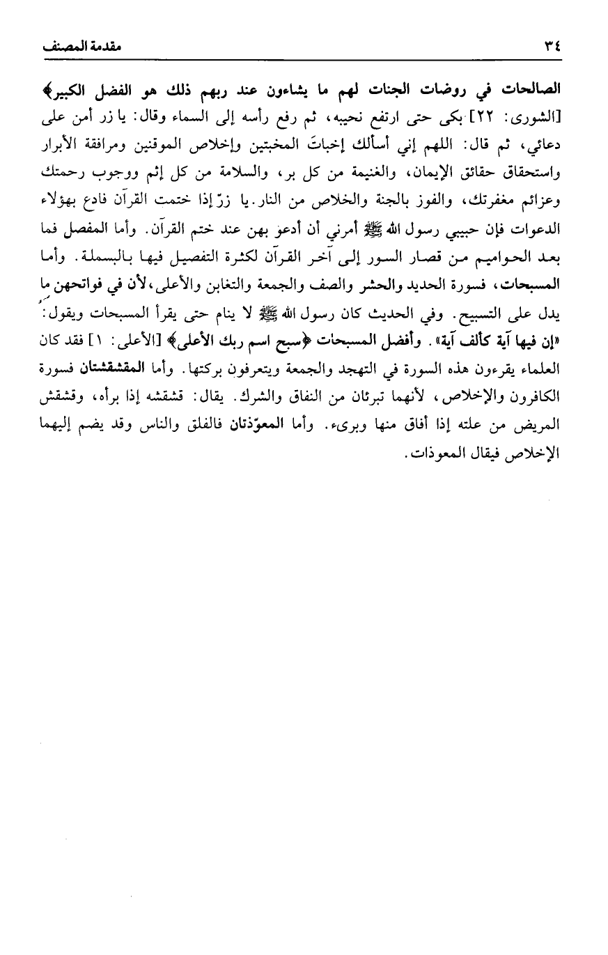 فقد كان العلماء يقرءون هذه السورة في التهجد والجمعة ويتعرفون بركتها. وأما المقشقشتان فسورة الكافرون والإخلاص، لأنهما تبرئان من النفاق والشرك. يقال: قشقشه إذا برأه، وقشقش المريض من علته إذا أفاق منها وبرىء. وأما المعوّذتان فالفلق والناس وقد يضم إليهما الإخلاص فيقال المعوذات.