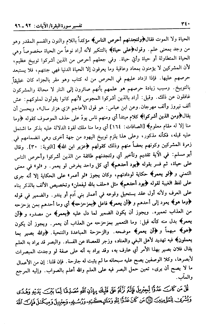 الحياة ولا الموت فقال وَلَتَجِدَنَّهُمْ أَحْرَصَ النَّاسِ مؤكدا باللام والنون والقسم المقدر وهو من وجد بمعنى علم. وقوله عَلى حَياةٍ بالتنكير لأنه أراد نوعا من الحياة مخصوصا وهي الحياة المتطاولة أو حياة وأيّ حياة. وفي جعلهم أحرص من الذين أشركوا توبيخ عظيم، لأن المشركين لا يؤمنون بمعاد وعاقبة وما يعرفون إلا الحياة الدنيا فهي جنتهم، فلا يستبعد حرصهم عليها. فإذا ازداد عليهم في الحرص من له كتاب وهو مقر بالجزاء كان خليقا بالتوبيخ. وسبب زيادة حرصهم هو علمهم بأنهم صائرون إلى النار لا محالة والمشركون غافلون عن ذلك. وقيل: أراد بالذين أشركوا المجوس لأنهم كانوا يقولون لملوكهم: عش ألف نيروز وألف مهرجان. وعن ابن عباس: هو قول الأعاجم «زي هزار سال» ، ويحسن أن يقال وَمِنَ الَّذِينَ أَشْرَكُوا كلام مبتدأ أي ومنهم ناس يودّ على حذف الموصوف كقوله وَما مِنَّا إِلَّا لَهُ مَقامٌ مَعْلُومٌ [الصافات: 164] أي وما منا ملك لقوة الدلالة عليه بذكر ما اشتمل عليه قبله، فكأنه مذكور، وعلى هذا يلزم توبيخ اليهود من جهة أخرى وهي انضمامهم في زمرة المشركين وكونهم بعضا منهم وذلك كقولهم عُزَيْرٌ ابْنُ اللَّهِ [التوبة: 30] . وقال أبو مسلم: في الآية تقديم وتأخير أي ولتجدنهم طائفة من الذين أشركوا وأحرص الناس على حياة، ثم فسر بقوله يَوَدُّ أَحَدُهُمْ أي كل واحد يغرض لو يعمر. و «لو» في معنى التمني ولَوْ يُعَمَّرُ حكاية لودادتهم، وكان يجوز «لو أعمر» على الحكاية إلا أنه جرى على لفظ الغيبة لقوله يَوَدُّ أَحَدُهُمْ مثل «حلف بالله ليفعلن» وتخصيص الألف بالذكر بناء على العرف ولأنه أول عقد يستحيل وقوعه في أعمار بني آدم أو يندر. والضمير في قوله وَما هُوَ يعود إلى أحدهم وأَنْ يُعَمَّرَ فاعل بِمُزَحْزِحِهِ أي وما أحدهم بمن يزحزحه من العذاب تعميره. ويجوز أن يكون الضمير لما دل عليه يُعَمَّرُ من مصدره وأَنْ يُعَمَّرَ بدل منه كأنه قيل: وما التعمير بمزحزحه من العذاب أن يعمر. ويجوز أن يكون هُوَ مبهما وأَنْ يُعَمَّرَ موضحه. والزحزحة المباعدة والتنحية. وَاللَّهُ بَصِيرٌ بِما يَعْمَلُونَ فيه تهديد لأهل البغي والعناد، وزجر للعصاة عن الفساد. والبصر قد يراد به العلم يقال فلان بصير بهذا الأمر أي عارف به، وقد يراد به أنه على صفة لو وجدت المبصرات لأبصرها، وكلا الوصفين يصح عليه سبحانه ما لم يثبت له جارحة. فإن قلنا: إن من الأعمال ما لا يصح أن يرى، تعين حمل البصر فيه على العلم والله أعلم بالصواب. وإليه المرجع والمآب.