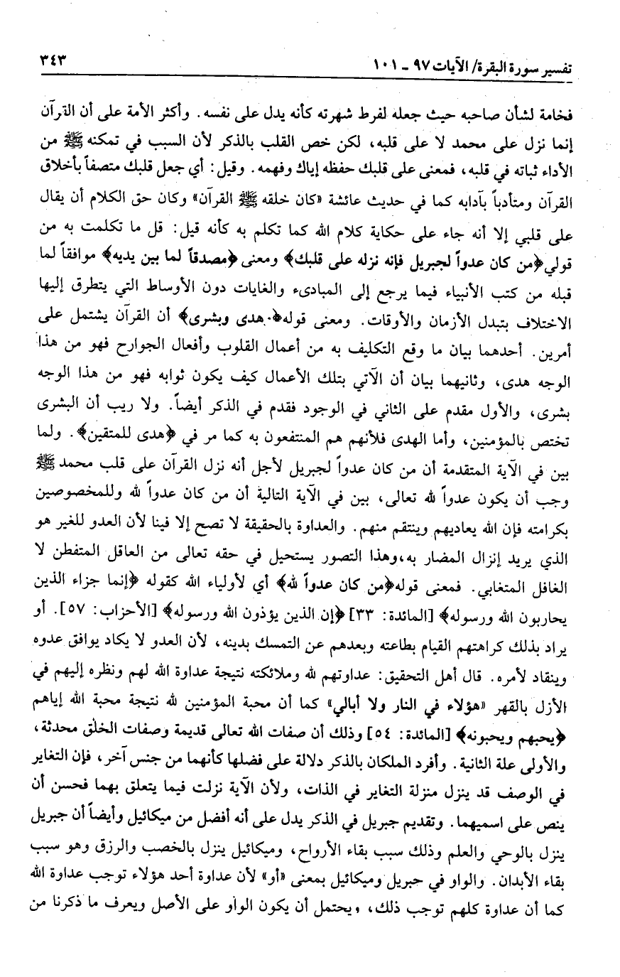 كما أن محبة المؤمنين لله نتيجة محبة الله إياهم يُحِبُّهُمْ وَيُحِبُّونَهُ [المائدة: 54] وذلك أن صفات الله تعالى قديمة وصفات الخلق محدثة، والأولى علة الثانية. وأفرد الملكان بالذكر دلالة على فضلها كأنهما من جنس آخر، فإن التغاير في الوصف قد ينزل منزلة التغاير في الذات، ولأن الآية نزلت فيما يتعلق بهما فحسن أن ينص على اسميهما. وتقديم جبريل في الذكر يدل على أنه أفضل من ميكائيل وأيضا أن جبريل ينزل بالوحي والعلم وذلك سبب بقاء الأرواح، وميكائيل ينزل بالخصب والرزق وهو سبب بقاء الأبدان. والواو في جبريل وميكائيل بمعنى «أو» لأن عداوة أحد هؤلاء توجب عداوة الله كما أن عداوة كلهم توجب ذلك، ويحتمل أن يكون الواو على الأصل ويعرف ما ذكرنا من