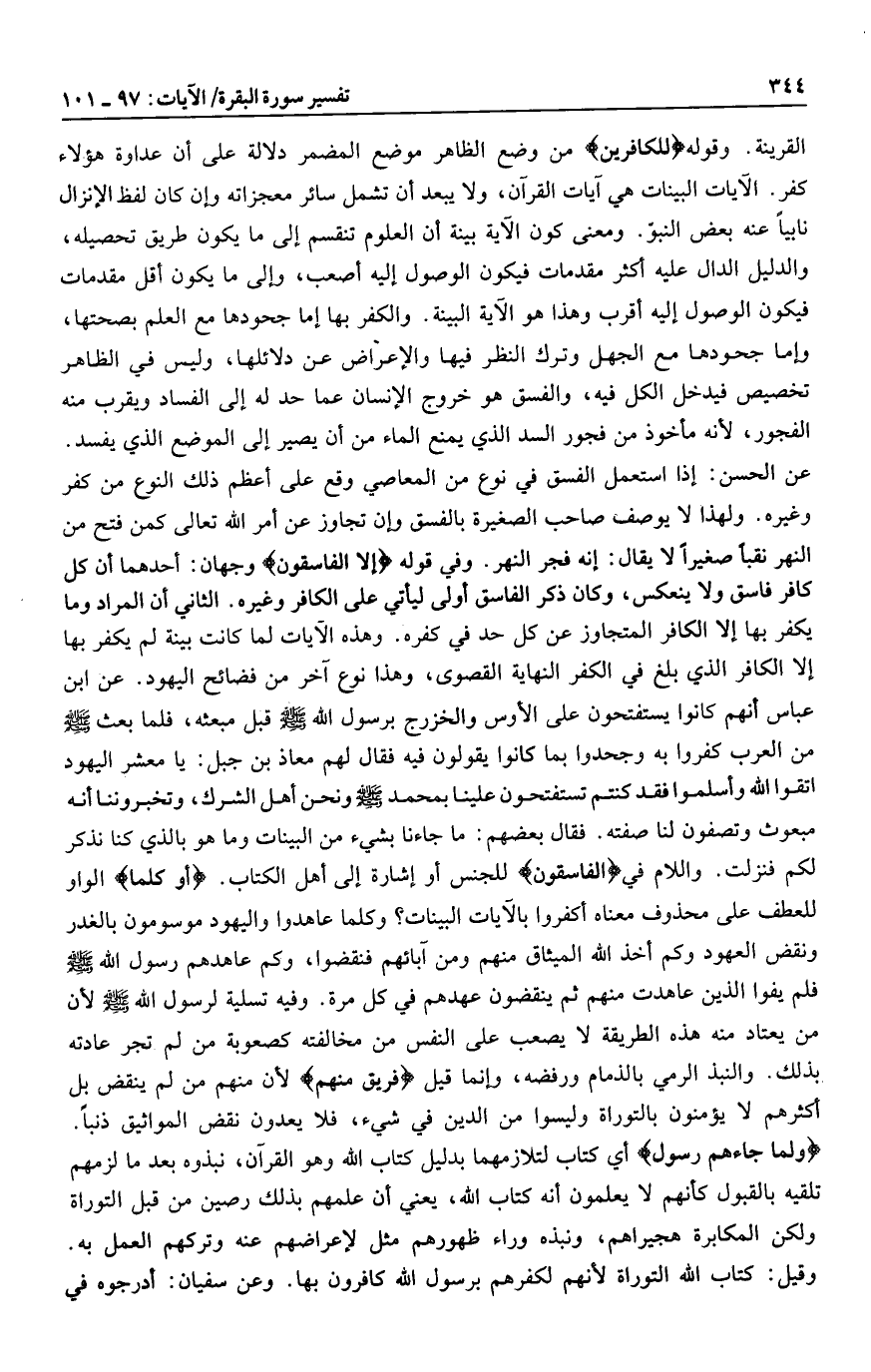 عن الحسن: إذا استعمل الفسق في نوع من المعاصي وقع على أعظم ذلك النوع من كفر وغيره. ولهذا لا يوصف صاحب الصغيرة بالفسق وإن تجاوز عن أمر الله تعالى كمن فتح من النهر نقبا صغيرا لا يقال: إنه فجر النهر. وفي قوله إِلَّا الْفاسِقُونَ وجهان: أحدهما أن كل كافر فاسق ولا ينعكس، وكان ذكر الفاسق أولى ليأتي على الكافر وغيره. الثاني أن المراد وما يكفر بها إلا الكافر المتجاوز عن كل حد في كفره. وهذه الآيات لما كانت بينة لم يكفر بها إلا الكافر الذي بلغ في الكفر النهاية القصوى، وهذا نوع آخر من فضائح اليهود. عن ابن عباس أنهم كانوا يستفتحون على الأوس والخزرج برسول الله صلى الله عليه وسلم قبل مبعثه، فلما بعث صلى الله عليه وسلم من العرب كفروا به وجحدوا بما كانوا يقولون فيه فقال لهم معاذ بن جبل: يا معشر اليهود اتقوا الله وأسلموا فقد كنتم تستفتحون علينا بمحمد صلى الله عليه وسلم ونحن أهل الشرك، وتخبروننا أنه مبعوث وتصفون لنا صفته. فقال بعضهم: ما جاءنا بشيء من البينات وما هو بالذي كنا نذكر لكم فنزلت. واللام في الْفاسِقُونَ للجنس أو إشارة إلى أهل الكتاب. أَوَكُلَّما الواو للعطف على محذوف معناه أكفروا بالآيات البينات؟ وكلما عاهدوا واليهود موسومون بالغدر ونقض العهود وكم أخذ الله الميثاق منهم ومن آبائهم فنقضوا، وكم عاهدهم رسول الله صلى الله عليه وسلم فلم يفوا الذين عاهدت منهم ثم ينقضون عهدهم في كل مرة. وفيه تسلية لرسول الله صلى الله عليه وسلم لأن من يعتاد منه هذه الطريقة لا يصعب على النفس من مخالفته كصعوبة من لم تجر عادته بذلك. والنبذ الرمي بالذمام ورفضه، وإنما قيل فَرِيقٌ مِنْهُمْ لأن منهم من لم ينقض بل أكثرهم لا يؤمنون بالتوراة وليسوا من الدين في شيء، فلا يعدون نقض المواثيق ذنبا.