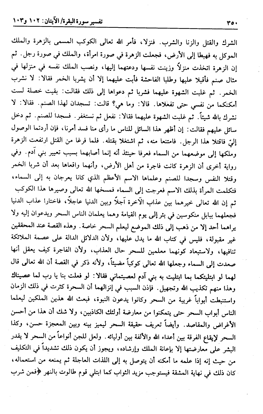 ، وأنهما واقعاها بعد أن شربا الخمر وقتلا النفس وسجدا للصنم وعلماها الاسم الأعظم الذي كانا يعرجان به إلى السماء، فتكلمت المرأة بذلك الاسم فعرجت إلى السماء فمسخها الله تعالى وصيرها هذا الكوكب ثم إن الله تعالى خيرهما بين عذاب الآخرة آجلا وبين الدنيا عاجلا، فاختارا عذاب الدنيا فجعلهما ببابل منكوسين في بئر إلى يوم القيامة وهما يعلمان الناس السحر ويدعوان إليه ولا يراهما أحد إلا من ذهب إلى ذلك الموضع ليعلم السحر خاصة. وهذه القصة عند المحققين غير مقبولة، فليس في كتاب الله ما يدل عليها، ولأن الدلائل الدالة على عصمة الملائكة تنافيها، ولاستبعاد كونهما معلمين للسحر حال العذاب، ولأن الفاجرة كيف يعقل أنها صعدت إلى السماء وجعلها الله تعالى كوكبا مضيئا، ولأنه ذكر في القصة أن الله تعالى قال لهما لو ابتليتكما بما ابتليت به بني آدم لعصيتماني فقالا: لو فعلت بنا يا رب لما عصيناك وهذا منهم تكذيب الله وتجهيل. فإذن السبب في إنزالهما أن السحرة كثرت في ذلك الزمان واستنبطت أبوابا غريبة من السحر وكانوا يدعون النبوة، فبعث الله هذين الملكين ليعلما الناس أبواب السحر حتى يتمكنوا من معارضة أولئك الكاذبين، ولا شك أن هذا من أحسن الأغراض والمقاصد. وأيضا تعريف حقيقة السحر ليميز بينه وبين المعجزة حسن، وكذا السحر لإيقاع الفرقة بين أعداء الله والألفة بين أوليائه. ولعل للجن أنواعا من السحر لا يقدر البشر على معارضتها إلا بإعانة الملك وإرشاده، ويجوز أن يكون ذلك تشديدا في التكليف من حيث إنه إذا علمه ما أمكنه أن يتوصل به إلى اللذات العاجلة ثم يمنعه من استعماله، كان ذلك في نهاية المشقة فيستوجب مزيد الثواب كما ابتلي قوم طالوت بالنهر فَمَنْ شَرِبَ