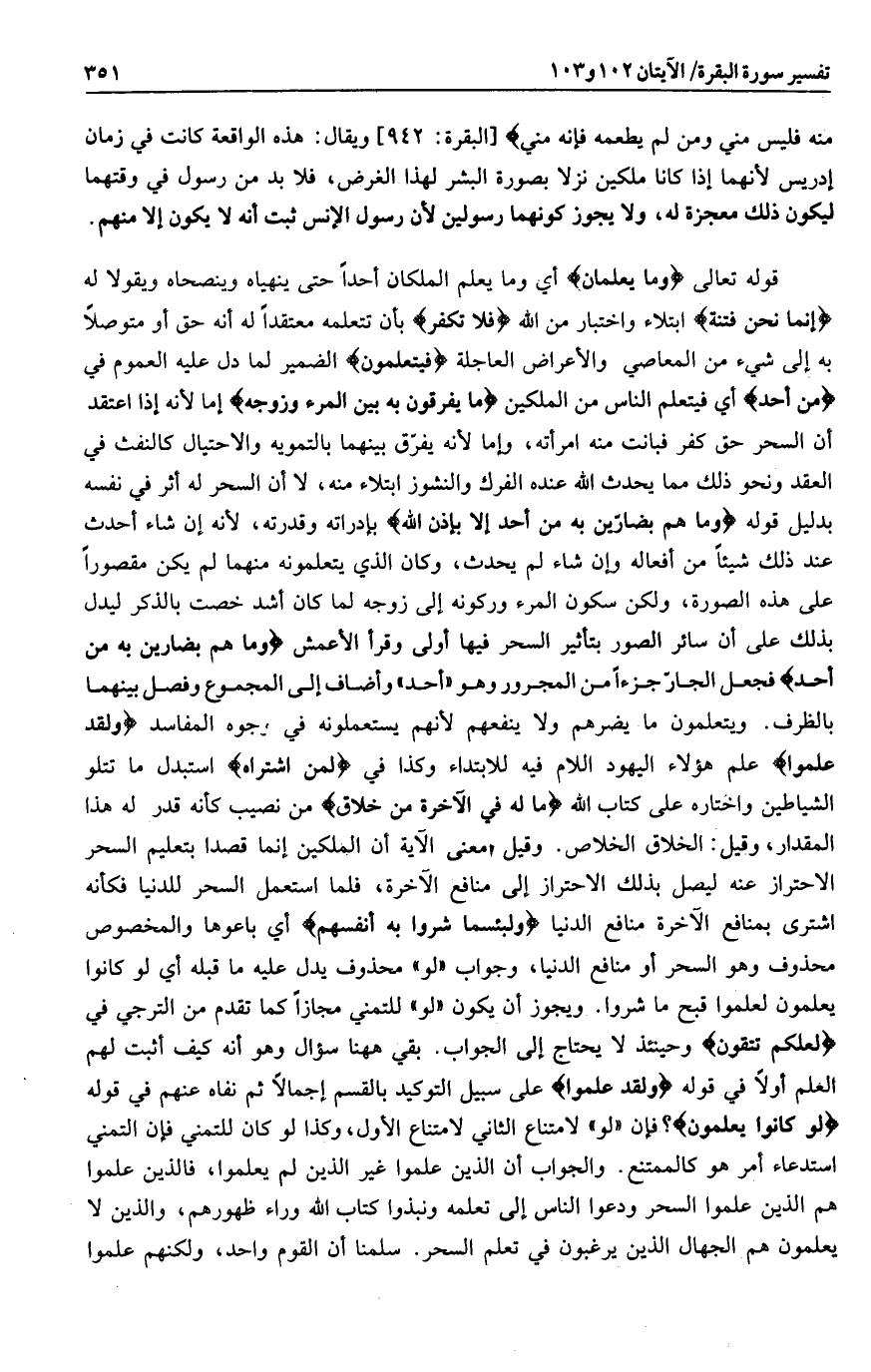 قوله تعالى وَما يُعَلِّمانِ أي وما يعلم الملكان أحدا حتى ينهياه وينصحاه ويقولا له إِنَّما نَحْنُ فِتْنَةٌ ابتلاء واختبار من الله فَلا تَكْفُرْ بأن تتعلمه معتقدا له أنه حق أو متوصلا به إلى شيء من المعاصي والأعراض العاجلة فَيَتَعَلَّمُونَ الضمير لما دل عليه العموم في مِنْ أَحَدٍ أي فيتعلم الناس من الملكين ما يُفَرِّقُونَ بِهِ بَيْنَ الْمَرْءِ وَزَوْجِهِ إما لأنه إذا اعتقد أن السحر حق كفر فبانت منه امرأته، وإما لأنه يفرّق بينهما بالتمويه والاحتيال كالنفث في العقد ونحو ذلك مما يحدث الله عنده الفرك والنشوز ابتلاء منه، لا أن السحر له أثر في نفسه بدليل قوله وَما هُمْ بِضارِّينَ بِهِ مِنْ أَحَدٍ إِلَّا بِإِذْنِ اللَّهِ بإدارته وقدرته، لأن إن شاء أحدث عند ذلك شيئا من أفعاله وإن شاء لم يحدث، وكان الذي يتعلمونه منهما لم يكن مقصورا على هذه الصورة، ولكن سكون المرء وركونه إلى زوجه لما كان أشد خصت بالذكر ليدل بذلك على أن سائر الصور بتأثير السحر فيها أولى وقرأ الأعمش وَما هُمْ بِضارِّينَ بِهِ مِنْ أَحَدٍ فجعل الجارّ جزءا من المجرور وهو «أحد» وأضاف إلى المجموع وفصل بينهما بالظرف. ويتعلمون ما يضرهم ولا ينفعهم لأنهم يستعملونه في وجوه المفاسد وَلَقَدْ عَلِمُوا علم هؤلاء اليهود اللام فيه للابتداء وكذا في لَمَنِ اشْتَراهُ استبدل ما تتلو الشياطين واختاره على كتاب الله ما لَهُ فِي الْآخِرَةِ مِنْ خَلاقٍ من نصيب كأنه قدر له هذا المقدار، وقيل: الخلاق الخلاص. وقيل معنى الآية أن الملكين إنما قصدا بتعليم السحر الاحتراز عنه ليصل بذلك الاحتراز إلى منافع الآخرة، فلما استعمل السحر للدنيا فكأنه اشترى بمنافع الآخرة منافع الدنيا وَلَبِئْسَ ما شَرَوْا بِهِ أَنْفُسَهُمْ أي باعوها والمخصوص محذوف وهو السحر أو منافع الدنيا، وجواب «لو» محذوف يدل عليه ما قبله أي لو كانوا يعلمون لعلموا قبح ما شروا. ويجوز أن يكون «لو» للتمني مجازا كما تقدم من الترجي في لَعَلَّكُمْ تَتَّقُونَ وحينئذ لا يحتاج إلى الجواب. بقي هاهنا سؤال وهو أنه كيف أثبت لهم العلم أولا في قوله وَلَقَدْ عَلِمُوا على سبيل التوكيد بالقسم إجمالا ثم نفاه عنهم في قوله لَوْ كانُوا يَعْلَمُونَ؟ فإن «لو» لامتناع الثاني لامتناع الأول، وكذا لو كان للتمني فإن التمني استدعاء أمر هو كالممتنع. والجواب أن الذين علموا غير الذين لم يعلموا، فالذين علموا هم الذين علموا السحر ودعوا الناس إلى تعلمه ونبذوا كتاب الله وراء ظهورهم، والذين لا يعلمون هم الجهال الذين يرغبون في تعلم السحر. سلمنا أن القوم واحد، ولكنهم علموا
