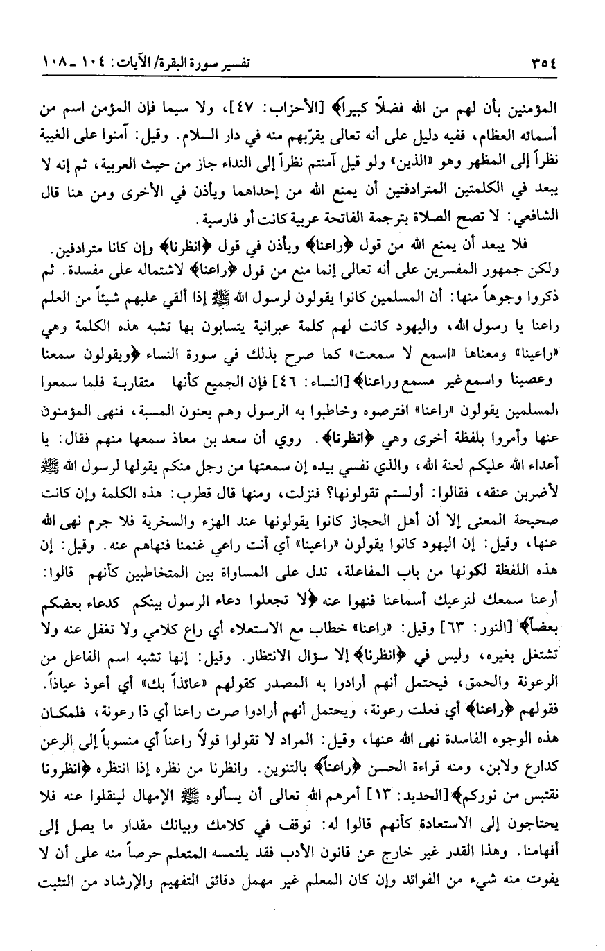 ومنها قال قطرب: هذه الكلمة وإن كانت صحيحة المعنى إلا أن أهل الحجاز كانوا يقولونها عند الهزء والسخرية فلا جرم نهى الله عنها، وقيل: إن اليهود كانوا يقولون «راعينا» أي أنت راعي غنمنا فنهاهم عنه. وقيل: إن هذه اللفظة لكونها من باب المفاعلة، تدل على المساواة بين المتخاطبين كأنهم قالوا: