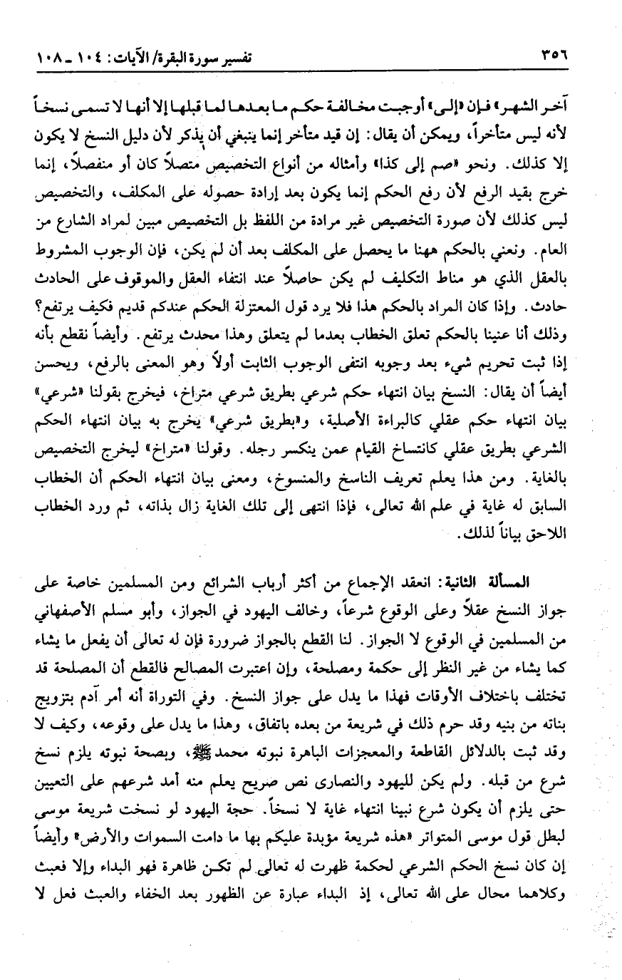 المسألة الثانية: انعقد الإجماع من أكثر أرباب الشرائع ومن المسلمين خاصة على جواز النسخ عقلا وعلى الوقوع شرعا، وخالف اليهود في الجواز، وأبو مسلم الأصفهاني من المسلمين في الوقوع لا الجواز. لنا القطع بالجواز ضرورة فإن له تعالى أن يفعل ما يشاء كما يشاء من غير النظر إلى حكمة ومصلحة، وإن اعتبرت المصالح فالقطع أن المصلحة قد تختلف باختلاف الأوقات فهذا ما يدل على جواز النسخ. وفي التوراة أنه أمر آدم بتزويج بناته من بنيه وقد حرم ذلك في شريعة من بعده باتفاق، وهذا ما يدل على وقوعه، وكيف لا وقد ثبت بالدلائل القاطعة والمعجزات الباهرة نبوته محمد صلّى الله عليه وآله وسلّم، وبصحة نبوته يلزم نسخ شرع من قبله. ولم يكن لليهود والنصارى نص صريح يعلم منه أمد شرعهم على التعيين حتى يلزم أن يكون شرع نبينا انتهاء غاية لا نسخا. حجة اليهود لو نسخت شريعة موسى لبطل قول موسى المتواتر «هذه شريعة مؤبدة عليكم بها ما دامت السموات والأرض» وأيضا إن كان نسخ الحكم الشرعي لحكمة ظهرت له تعالى لم تكن ظاهرة فهو البداء وإلا فعبث وكلاهما محال على الله تعالى، إذ البداء عبارة عن الظهور بعد الخفاء والعبث فعل لا