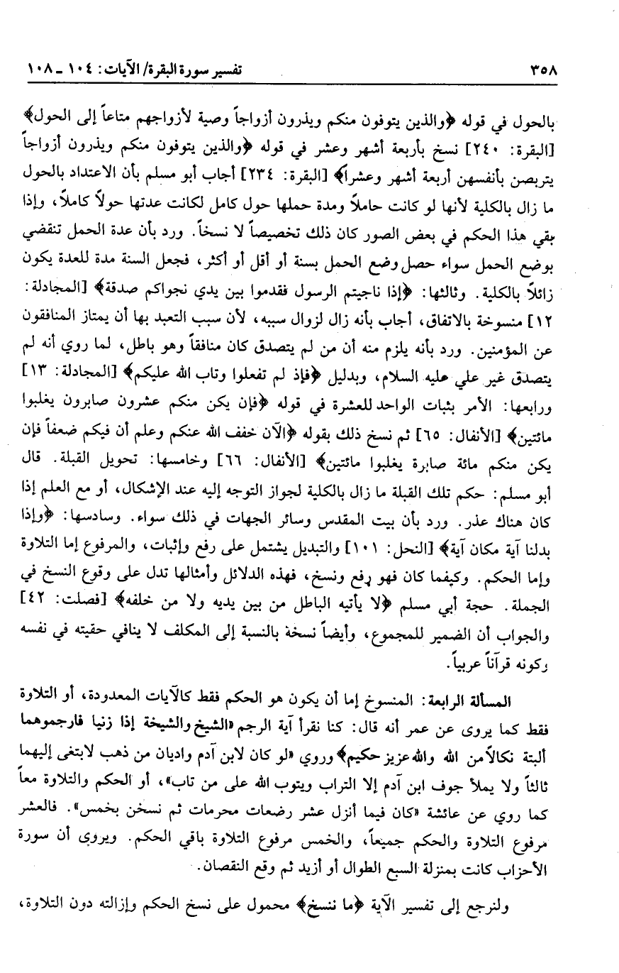 بالحول في قوله وَالَّذِينَ يُتَوَفَّوْنَ مِنْكُمْ وَيَذَرُونَ أَزْواجاً وَصِيَّةً لِأَزْواجِهِمْ مَتاعاً إِلَى الْحَوْلِ [البقرة: 240] نسخ بأربعة أشهر وعشر في قوله وَالَّذِينَ يُتَوَفَّوْنَ مِنْكُمْ وَيَذَرُونَ أَزْواجاً يَتَرَبَّصْنَ بِأَنْفُسِهِنَّ أَرْبَعَةَ أَشْهُرٍ وَعَشْراً [البقرة: 234] أجاب أبو مسلم بأن الاعتداد بالحول ما زال بالكلية لأنها لو كانت حاملا ومدة حملها حول كامل لكانت عدتها حولا كاملا، وإذا بقي هذا الحكم في بعض الصور كان ذلك تخصيصا لا نسخا. ورد بأن عدة الحمل تنقضي بوضع الحمل سواء حصل وضع الحمل بسنة أو أقل أو أكثر، فجعل السنة مدة للعدة يكون زائلا بالكلية. وثالثها: إِذا ناجَيْتُمُ الرَّسُولَ فَقَدِّمُوا بَيْنَ يَدَيْ نَجْواكُمْ صَدَقَةً [المجادلة: