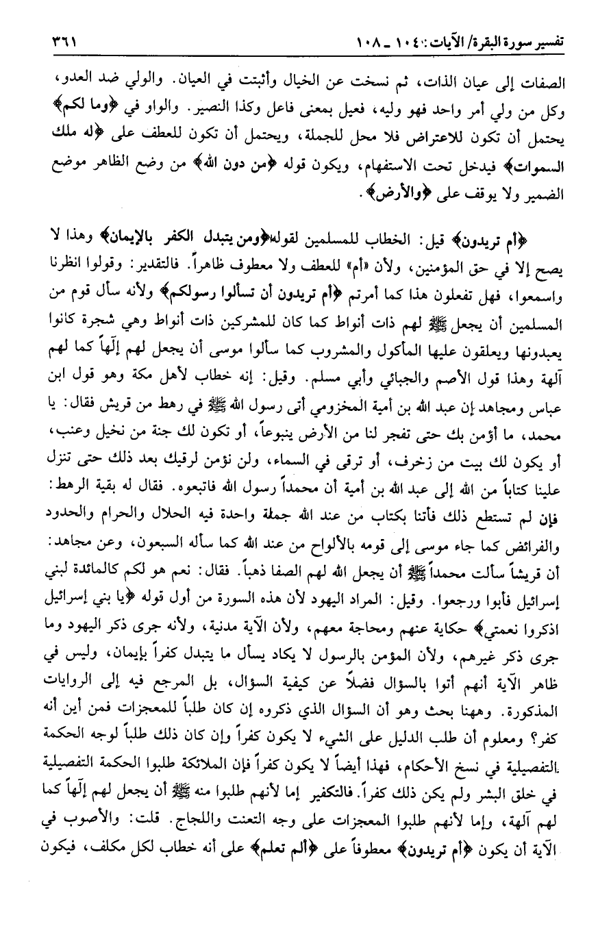 أَمْ تُرِيدُونَ قيل: الخطاب للمسلمين لقوله وَمَنْ يَتَبَدَّلِ الْكُفْرَ بِالْإِيمانِ وهذا لا يصح إلا في حق المؤمنين، ولأن «أم» للعطف ولا معطوف ظاهرا. فالتقدير: وقولوا انظرنا واسمعوا، فهل تفعلون هذا كما أمرتم أَمْ تُرِيدُونَ أَنْ تَسْئَلُوا رَسُولَكُمْ ولأنه سأل قوم من المسلمين أن يجعل صلى الله عليه وسلم لهم ذات أنواط كما كان للمشركين ذات أنواط وهي شجرة كانوا يعبدونها ويعلقون عليها المأكول والمشروب كما سألوا موسى أن يجعل لهم إلها كما لهم آلهة وهذا قول الأصم والجبائي وأبي مسلم.