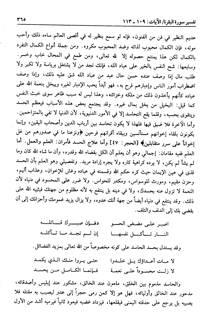 عديم النظير في فن من الفنون، فإنه لو سمع بنظير له في أقصى العالم ساءه ذلك وأحب موته، فإن الكمال محبوب لذاته وضد المحبوب مكروه. ومن جملة أنواع الكمال التفرد بالكمال لكن هذا يمتنع حصوله إلا لله تعالى، ومن طمع في المحال خاب وخسر.
